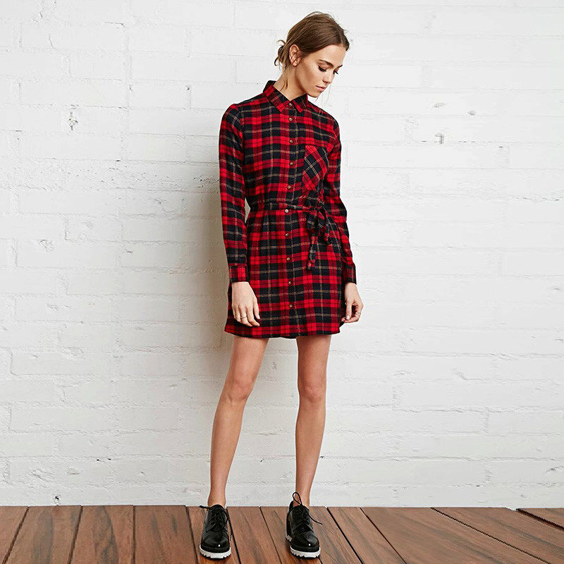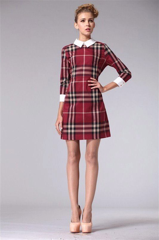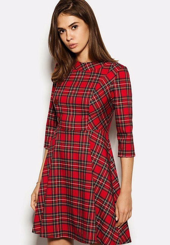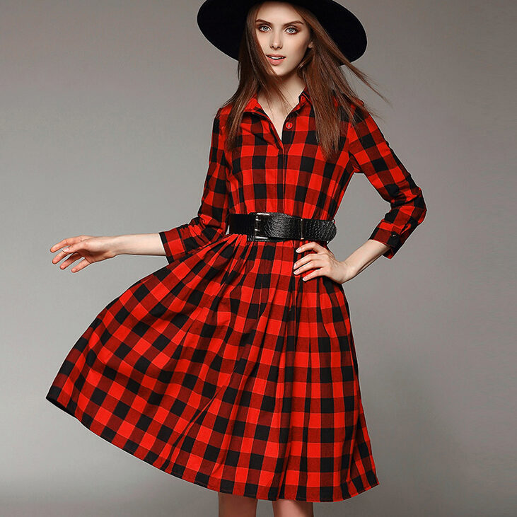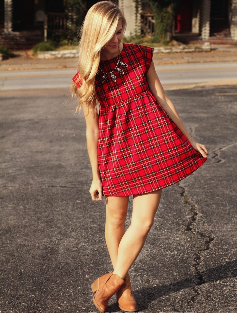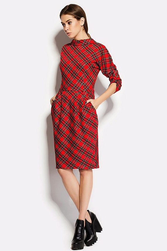 Plaid dresses of this length should be worn to work. Office checkered dress should be straight and without unnecessary details, can be with sleeves and without or a shallow slit at the back. For a standard figure, models of dresses of such length with large cells look very stylish and elegant. In this outfit, you can go not only to work, but also to study, and meetings.