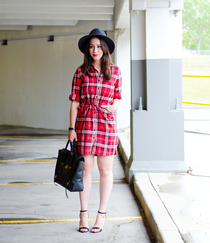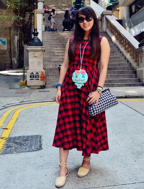 With a light spring red checkered dress it is quite possible to wear beautiful slippers, a hat, a bag and a few ornaments.