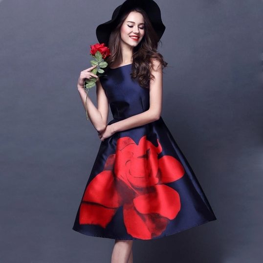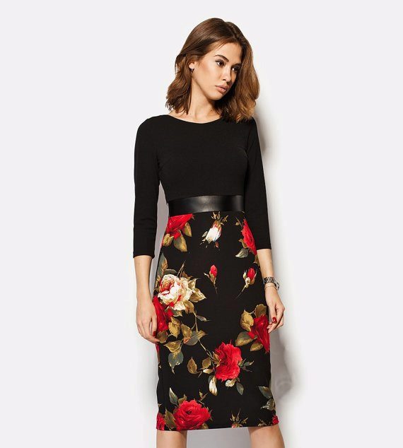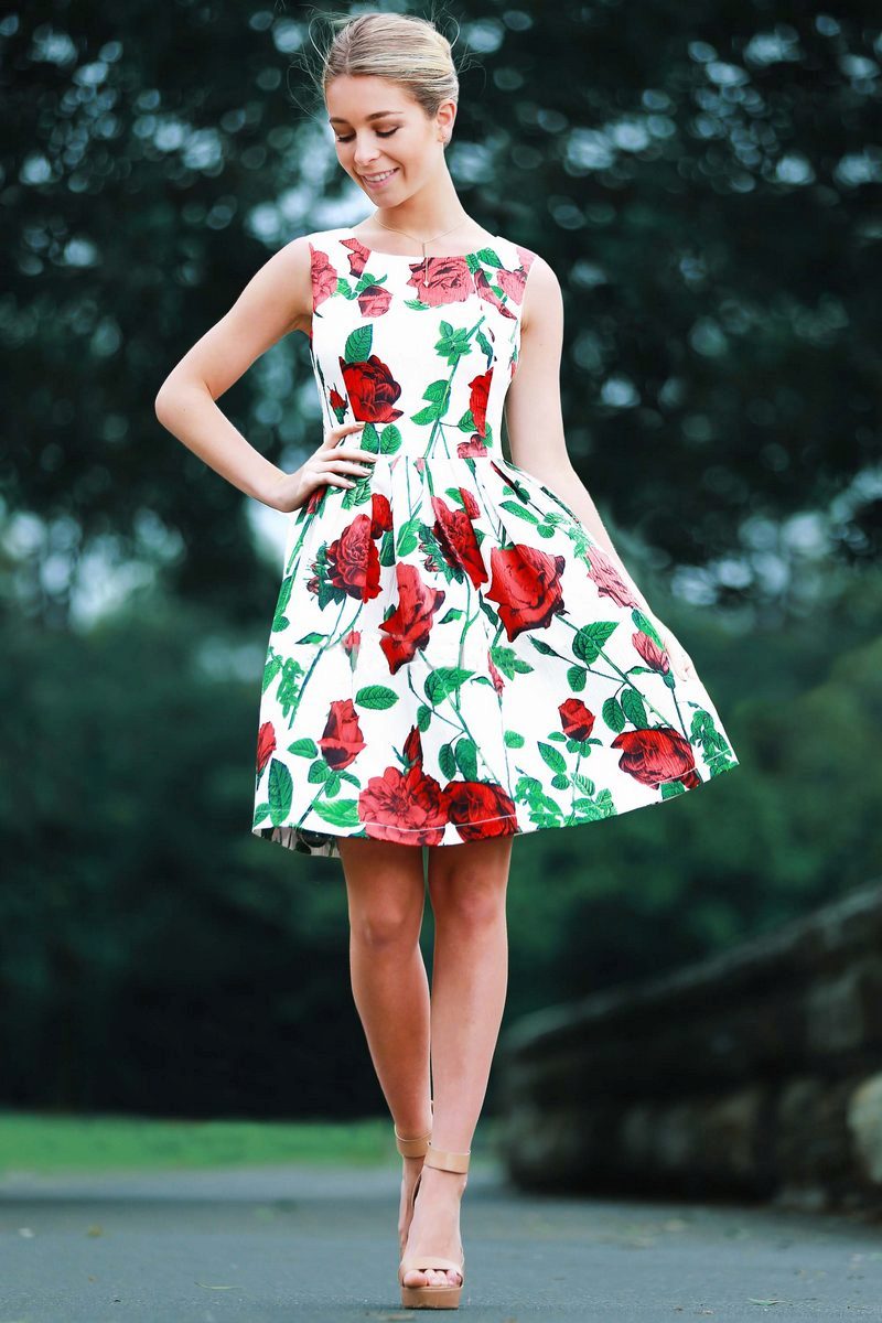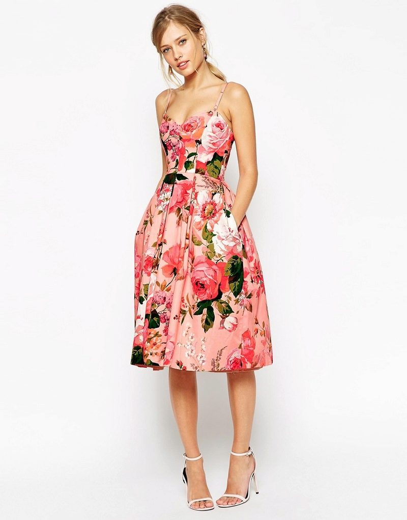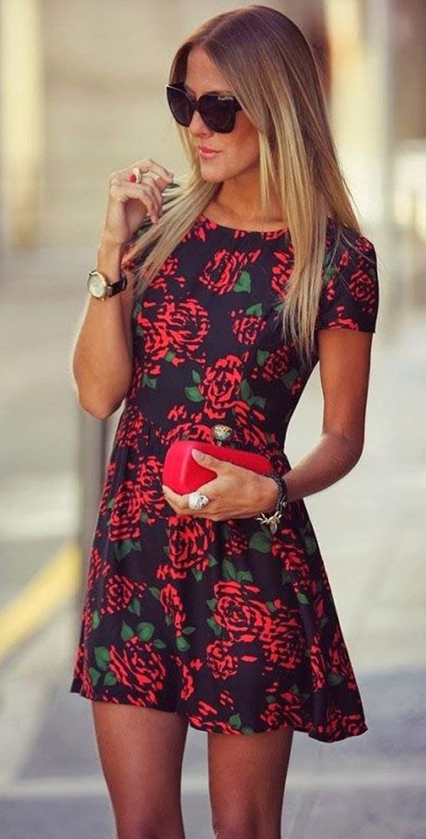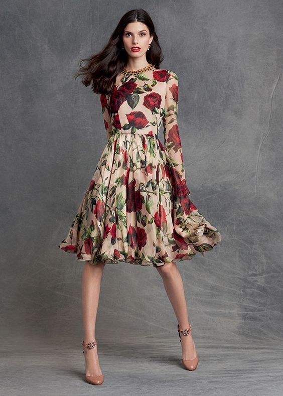 - The most common styles of dresses with a floral print, presented by roses are sundresses, long dresses with a skirt-sun, models with sleeves and medium length, as well as dresses with an open neckline.