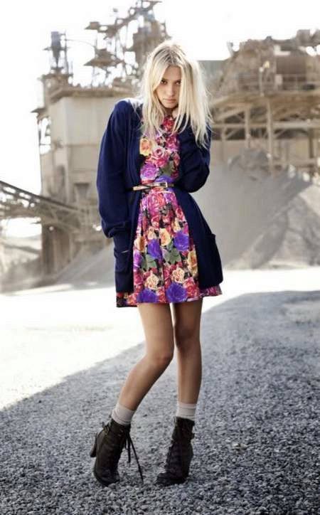 With the help of a dress with a pink print, a girl can create a fresh and delicate look. For this, the outfit is supplemented with monotonous, discreet things, for example, a cardigan, a cape, a jacket, a jacket or a jacket.
