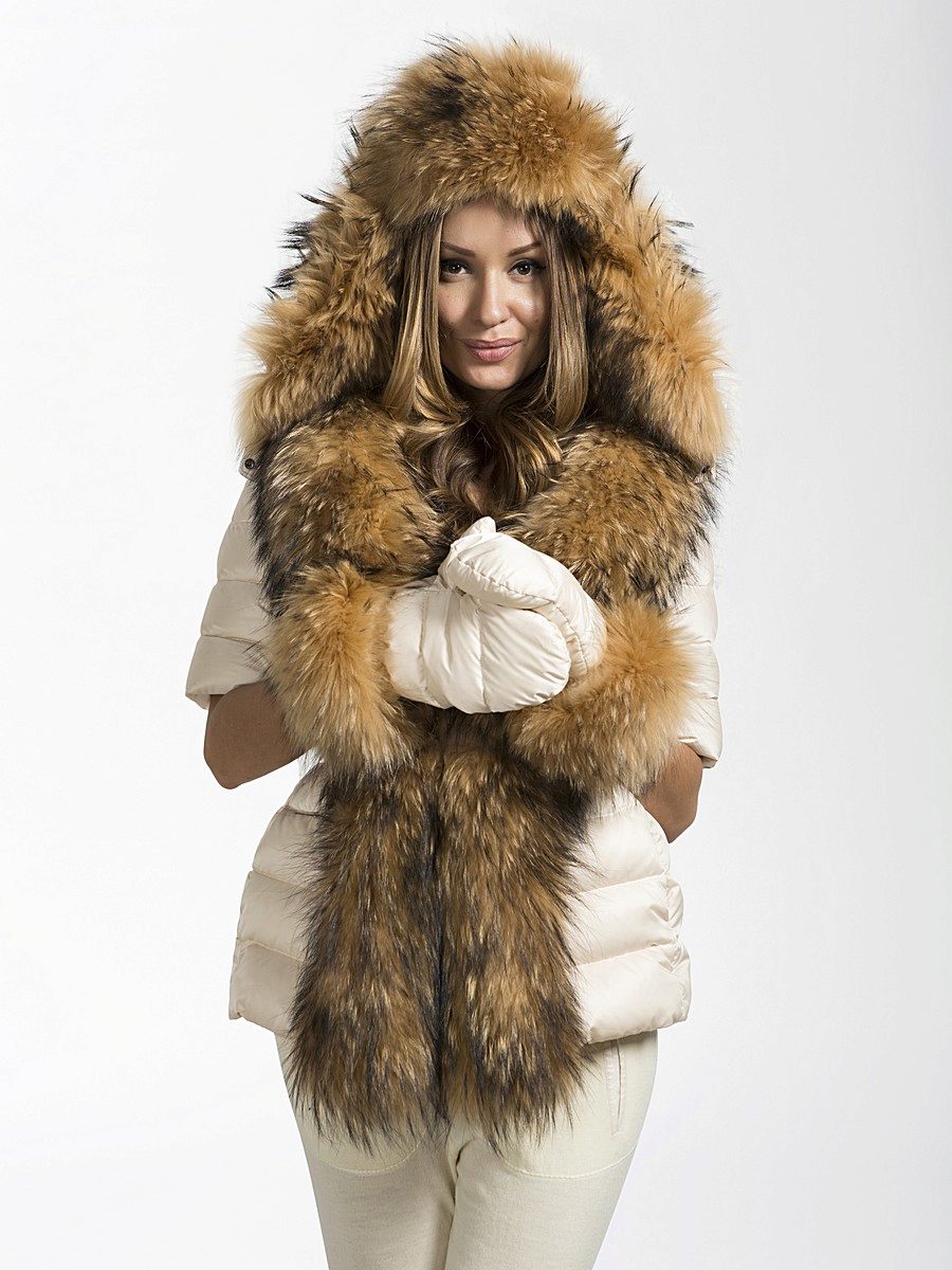 Hoods trimmed with fur, lined with fur inside, will decorate your down jacket. Sewn hoods match in color with the main product. There are hoods on the drawstring with fringed fur.