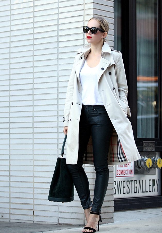 A beautiful image that will emphasize the personality of any girl. Leather pants, a white pullover, an elegant beige trench coat and black accessories are complemented effectively with red lipstick.
