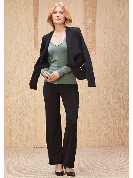 Stiletto heels in cold weather can be replaced with rounded-toe low shoes, and a jacket with a short fitted coat.