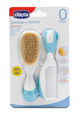 - Chicco - accessories for babies from this company can be bought in many children's departments. They are of different colors, suitable for both girls and boys. There are also neutral colors. Comb pens are rubberized and do not slip out of hands. And the tips of the scallop cloves are complemented with round balls to avoid injuries to the scalp.