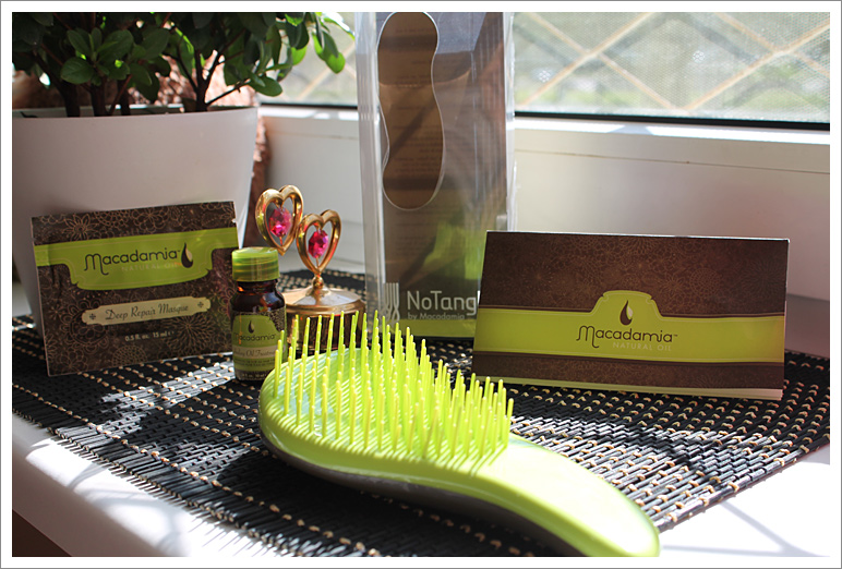 - The use of macadamia nut and argan oil as impregnation. Macadamia essential oil has a mass of beneficial properties. It is used in cooking, perfumery, cosmetology. It perfectly softens the skin, removes toxins, moisturizes, acts as a powerful antioxidant. In the process of each combing hair receive additional makeup;