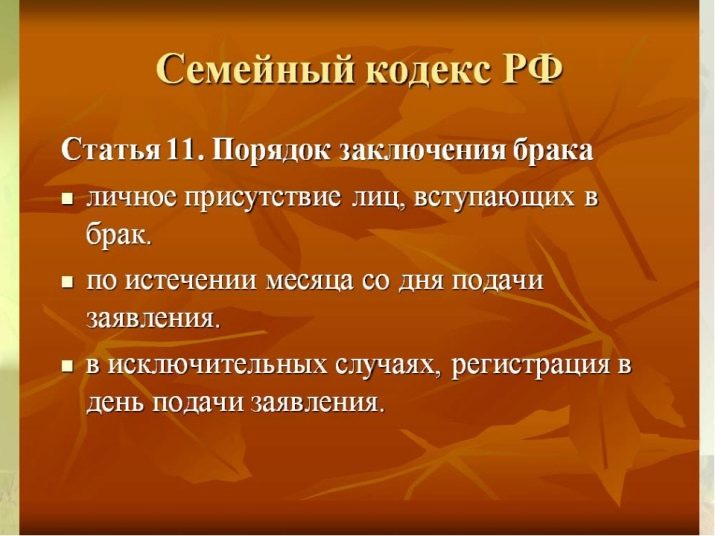 Terms of consideration. Article 11 of the Family Code of the Russian Federation states that a marriage is concluded 30 days after the submission of the application. This period is considered optimal for future spouses to weigh this crucial decision once more. It also happens that the bride and groom take away the statement, suddenly changing his mind to sign. The law allows civilian registry offices for one reason or another to increase to two months.