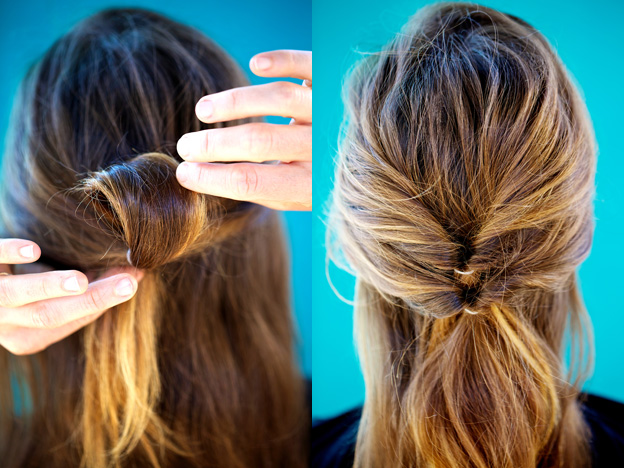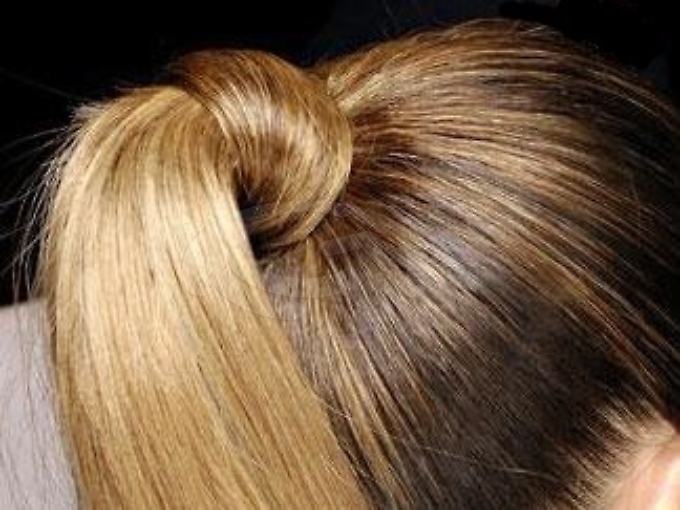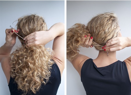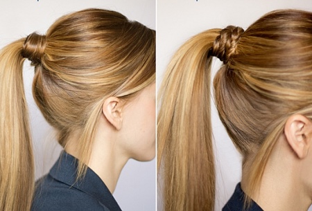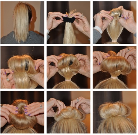 In order to make a neat and uniform beam, girls use volumetric gum, like sponges. Using it is very simple: you need to tie up the horse's tail, and, starting from the tips, wind the hair over the sponge so that they are evenly distributed over it. Then it will be necessary only to secure the finished beam with pins and invisibles.