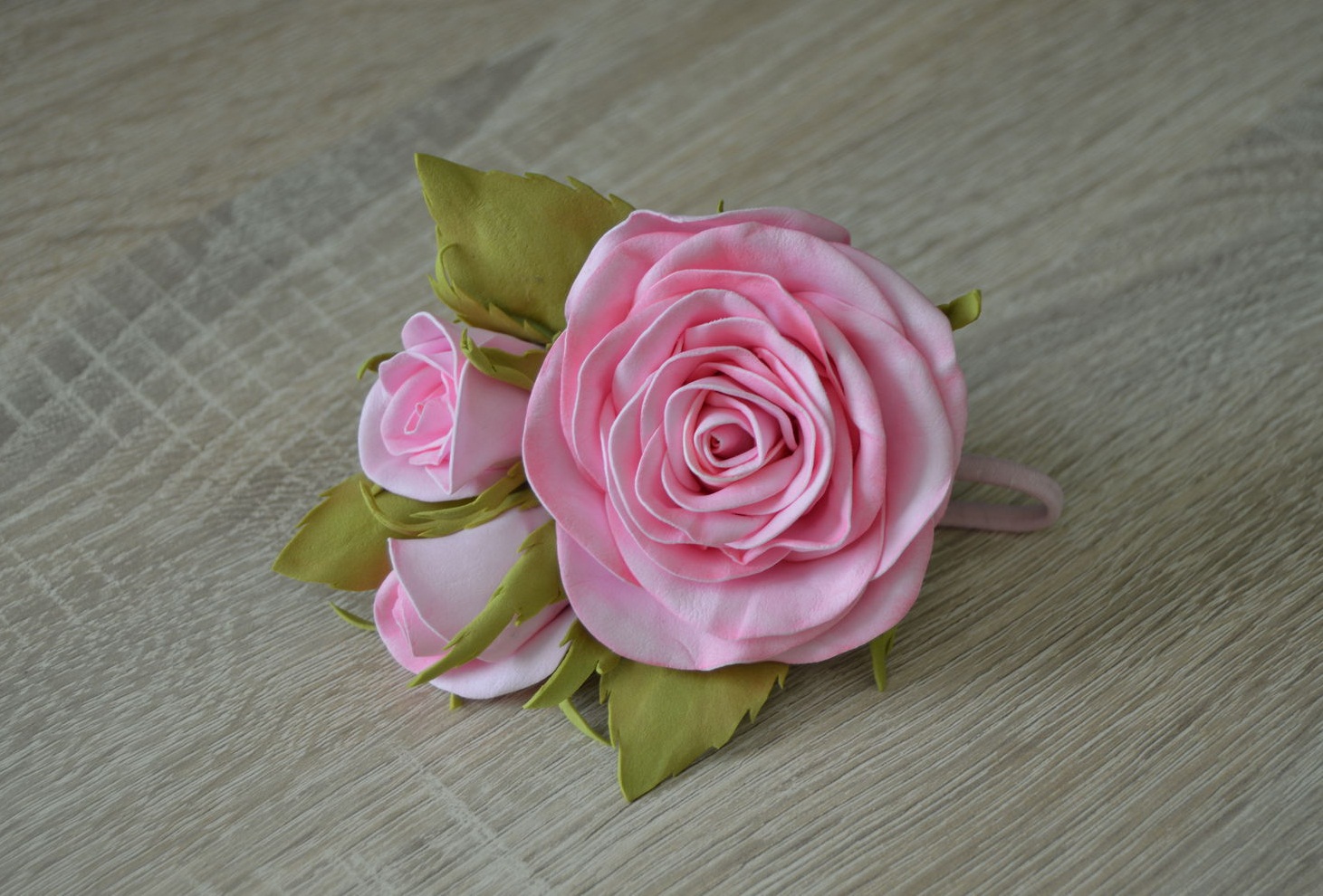 Modern artificial material, which is called plastic suede. It is great for creating decorative elements on rubber bands, as it keeps its shape well, does not crumple and does not deteriorate under the influence of moisture. Most often, all kinds of flowers are made from it, which look very natural.