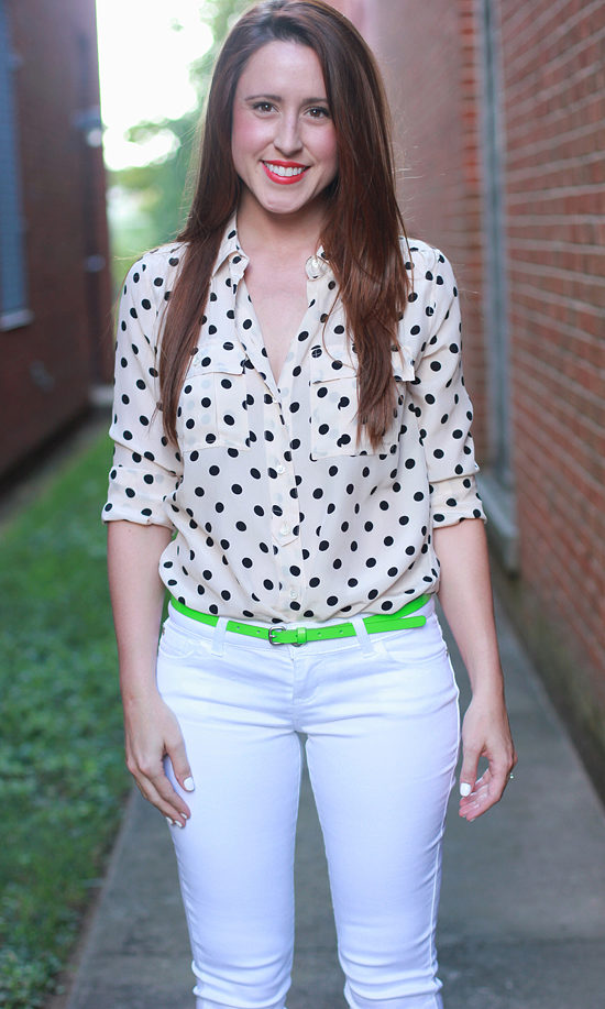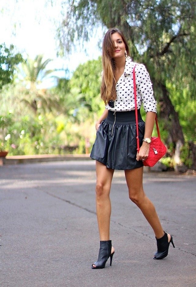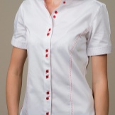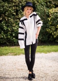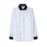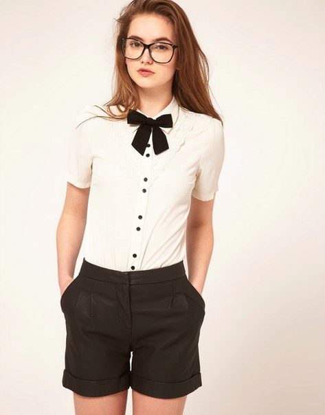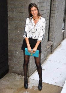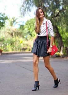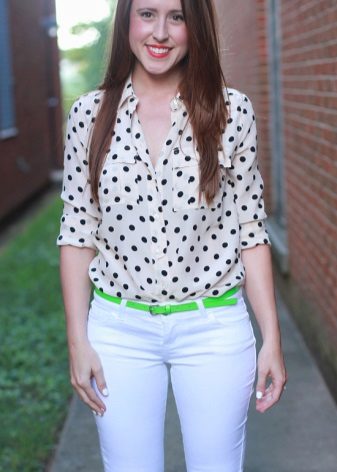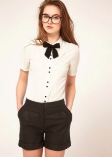 A very beautiful and stylish option is a white shirt with black inserts in the form of a collar and cuffs, as well as a print with small polka dots, a heart, or another print.