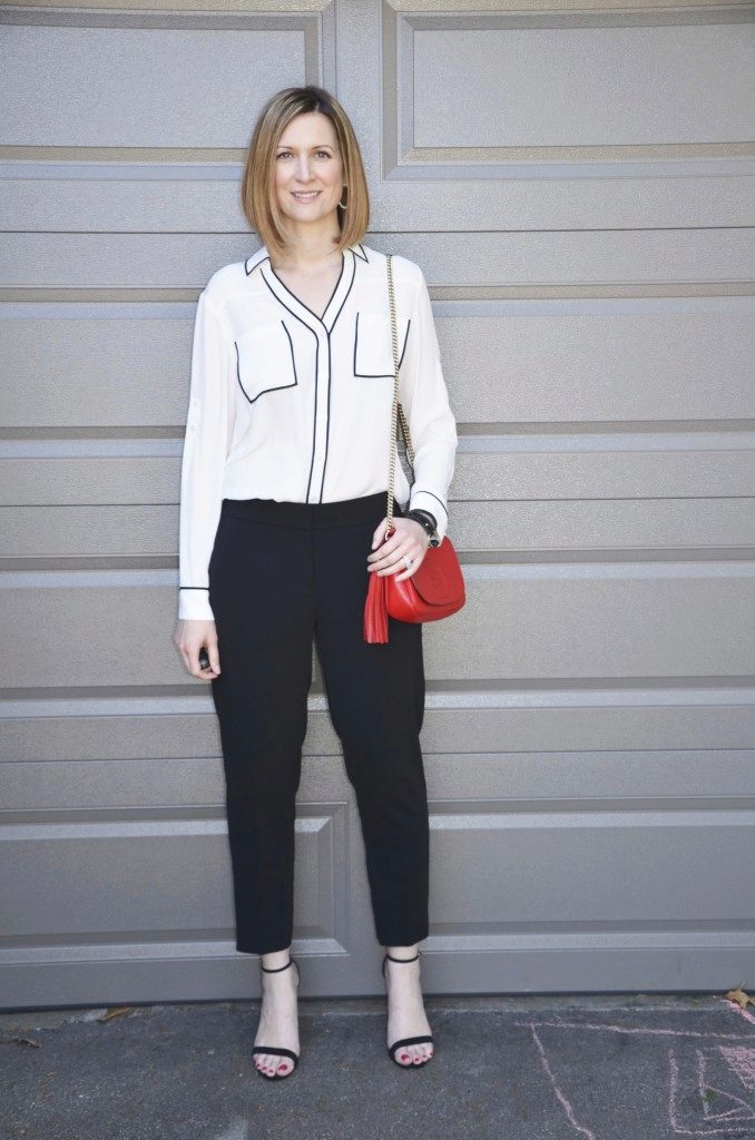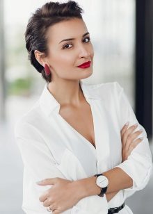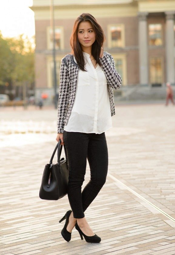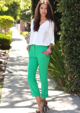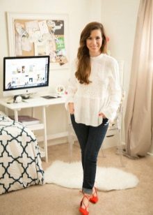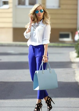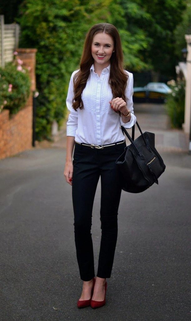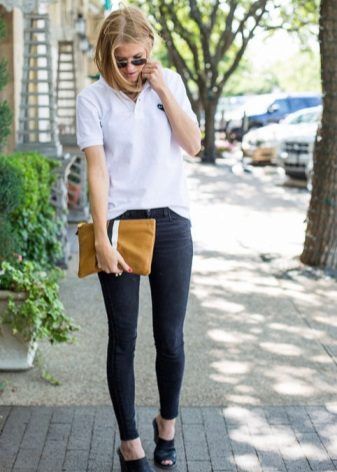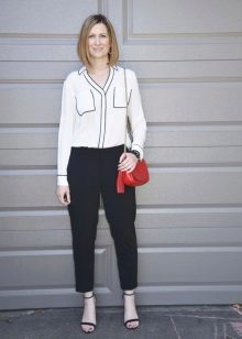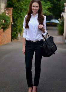 A plain white cotton shirt with a classic cut, the sleeve length of which can be absolutely anyone, is perfect for creating a business look. Let's pick up stylish trousers of black color, narrowed style with a seam, imitating an arrow. It is best to tuck the shirt inside the pants and decorate the belt with a thin strap with an inconspicuous buckle. A single-breasted black jacket with short cropped sleeves and black elegant pumps will complement the look. The image will be fresh, stylish, but at the same time fit into the framework of office style.