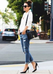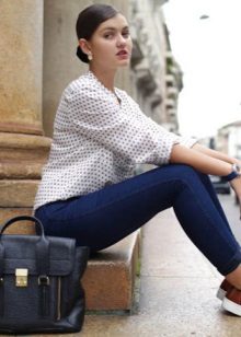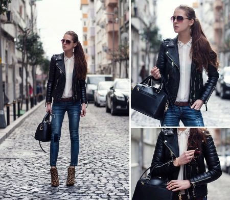 On a day off, for a walk with friends or going to the movies, a casual look with light, saucy elements is perfect. Narrow, slightly cropped jeans will look very nice with a chiffon shirt, the collar of which is decorated with small golden spikes, tucked inside and buttoned to the end. In cool weather as an outerwear, a leather jacket-jacket, length to the waist, will perfectly fit into this image. A highlight of the dress will be beautiful stylish shoe boots leopard colors. It is necessary to be careful not to overdo it with bright details, so in choosing a bag it is worth being limited to plain options.