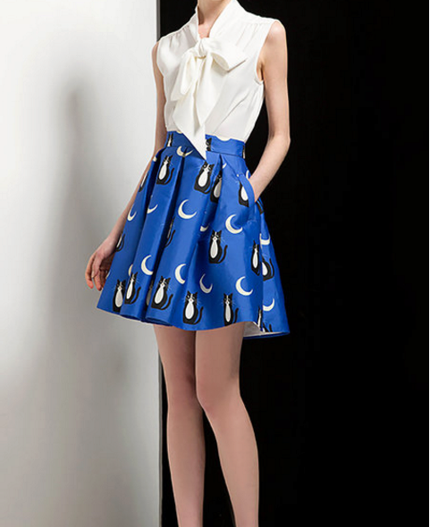 The combination of bright yellow and dark blue looks very beautiful. Black sandals and clutch act as a support, most importantly, there are no other details that distract attention from the main bright spot. Such an image should be taken as a basis in drawing up sets with a sleeveless shirt and guided by it.