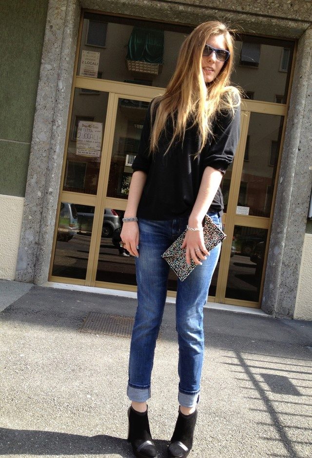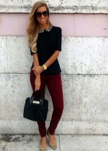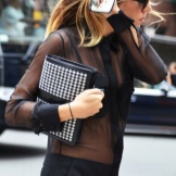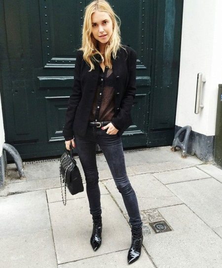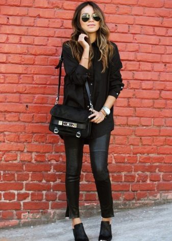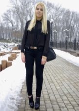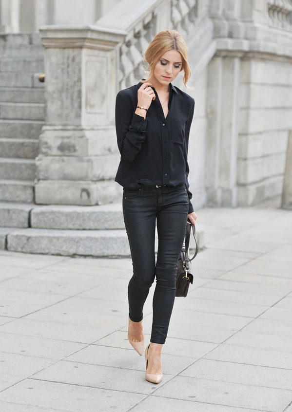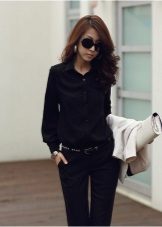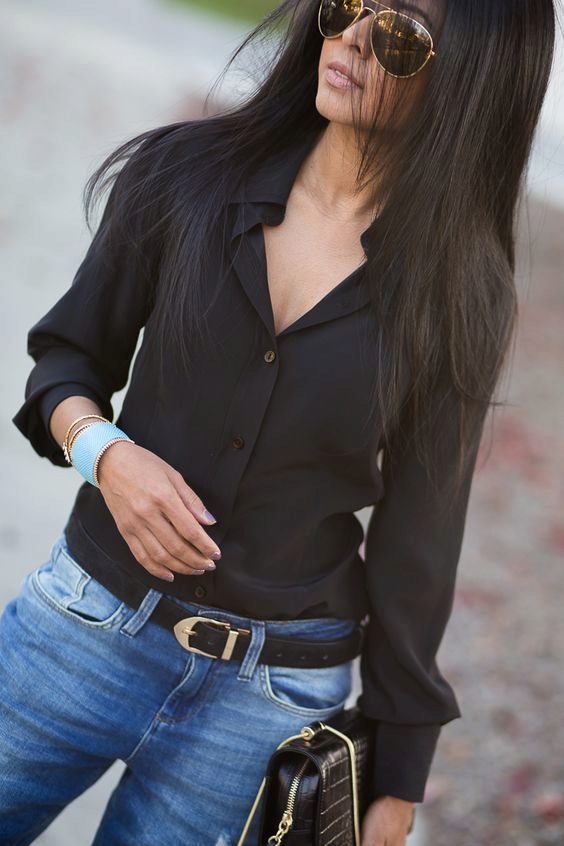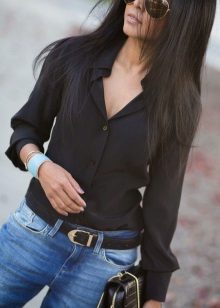 Black shirt can be worn not only with black and blue things. It looks great with red, yellow and white. But if you are wearing a black blouse with a black bottom, then you should decorate the image with a strap or a handbag of a contrasting shade.