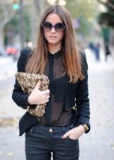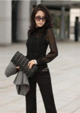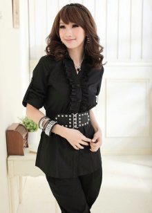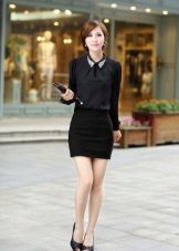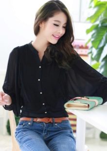 To meet friends, a black blouse can be combined with jeans or a blue skirt. Such a duet looks stylish and simple. A black blouse with a white collar is ideal for the solemn event, and the red details will bring a certain variety to the image.