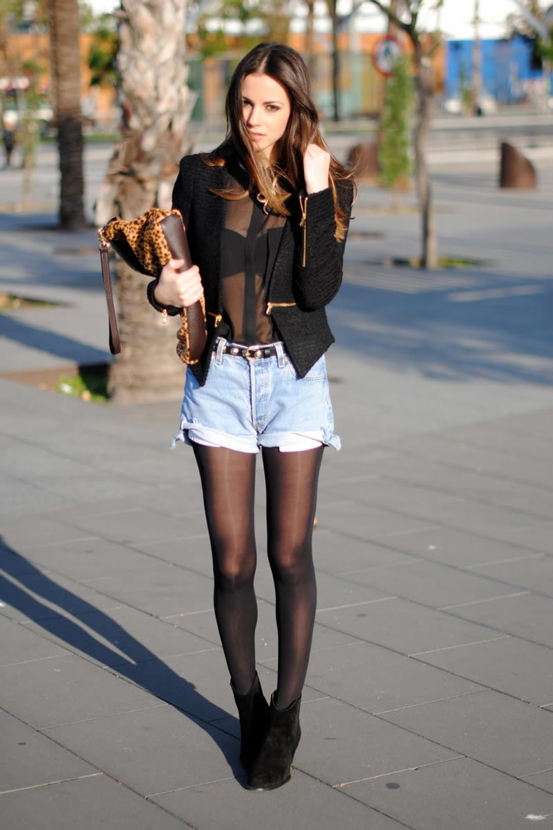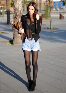 For hot summers, an excellent solution is a black shirt with a short sleeve of translucent or lightweight fabric and denim shorts.