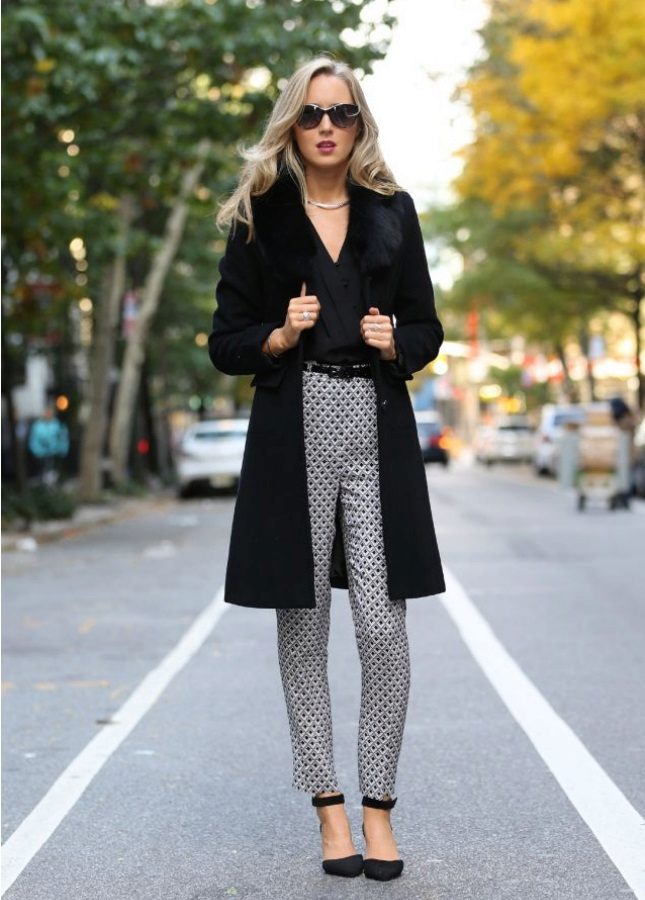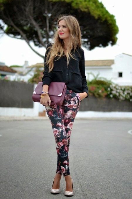 To create a romantic image, a black shirt in a tandem with trousers decorated with a floral print will be a stylish solution. Cream or silver stilettos perfectly complement the unique image. A small bag and soft jewelry will add to the silhouette of femininity.
