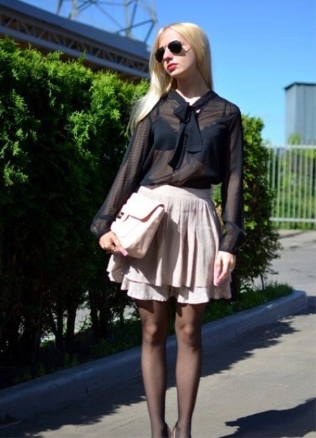 A black shirt without collar will create an unforgettable evening look. The material can be glossy or with a metallic effect. Chiffon skirt will help to add intrigue to the floor. To give an image of completeness, it is worth adding a bow with a small handbag, high-heeled shoes or varnished boots.