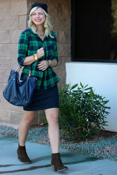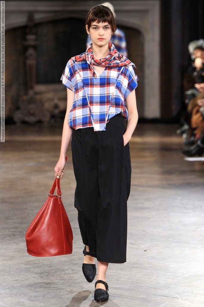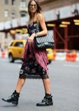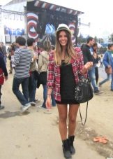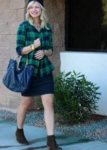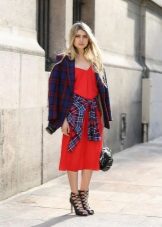 If you can't decide to wear a dress in a linen style, try to do it with a shirt in a cage. She eliminates excessive sexuality, making the image cozy and stylish. You can throw it on top in the unbuttoned form or tie at the waist, as in the photo. Complement the image of massive ankle boots and a red handbag on a long strap.