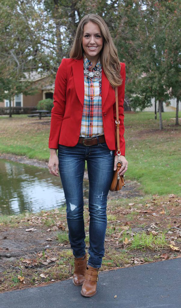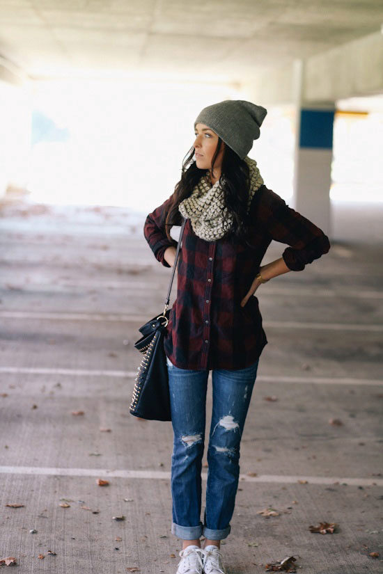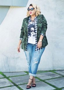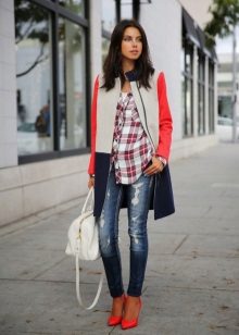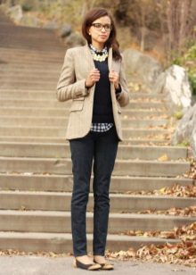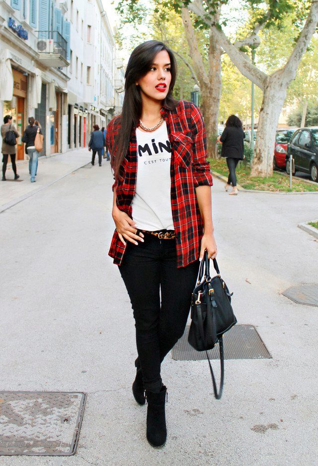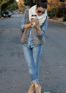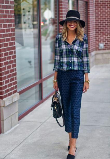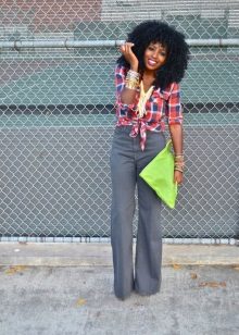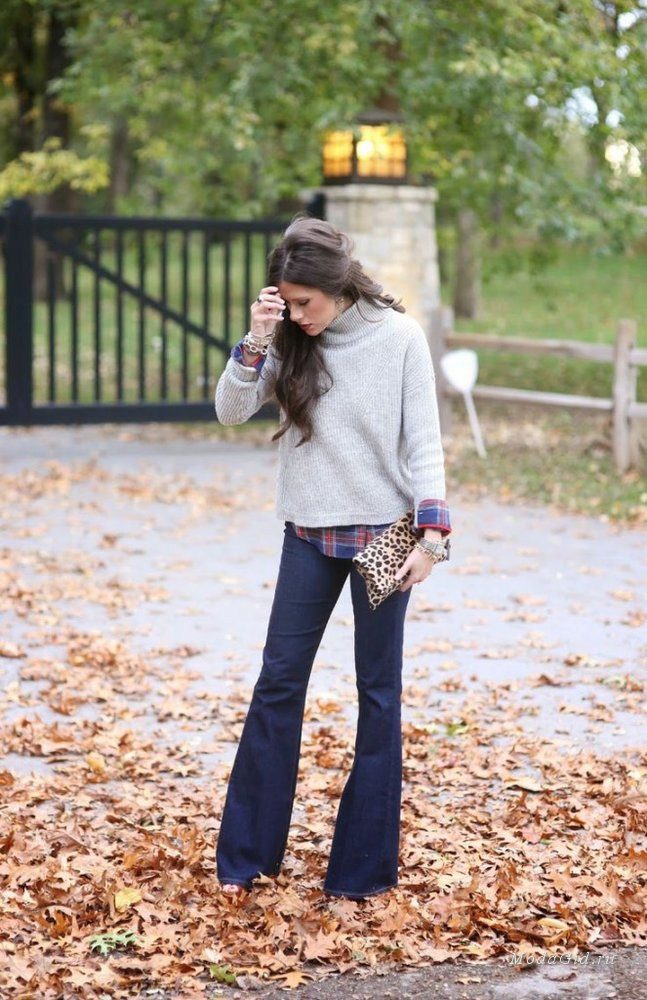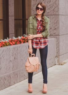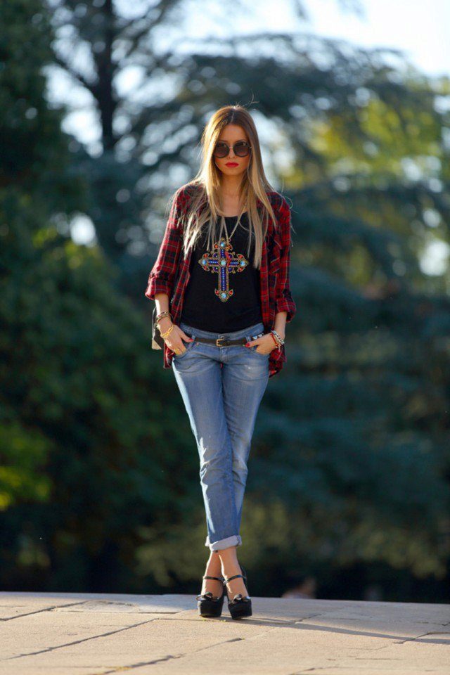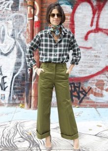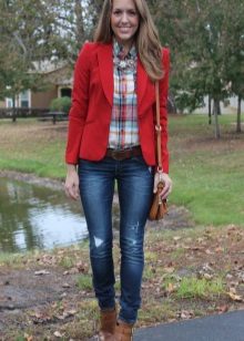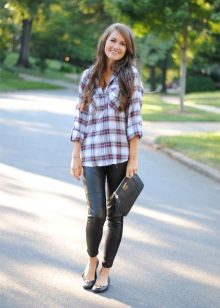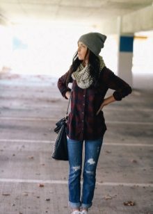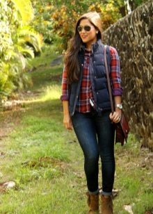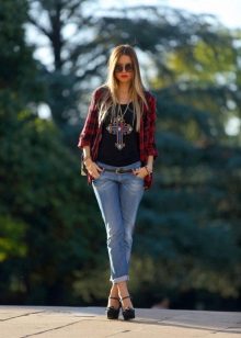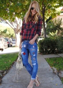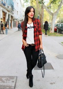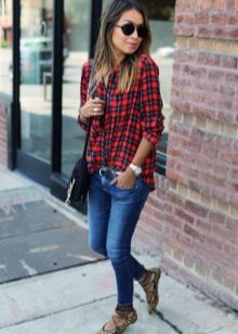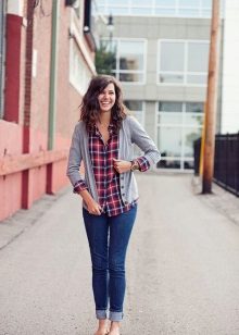The most popular combination is jeans and a plaid shirt. You can choose the style at your discretion, skinny, boyfriends and even flared will be good.