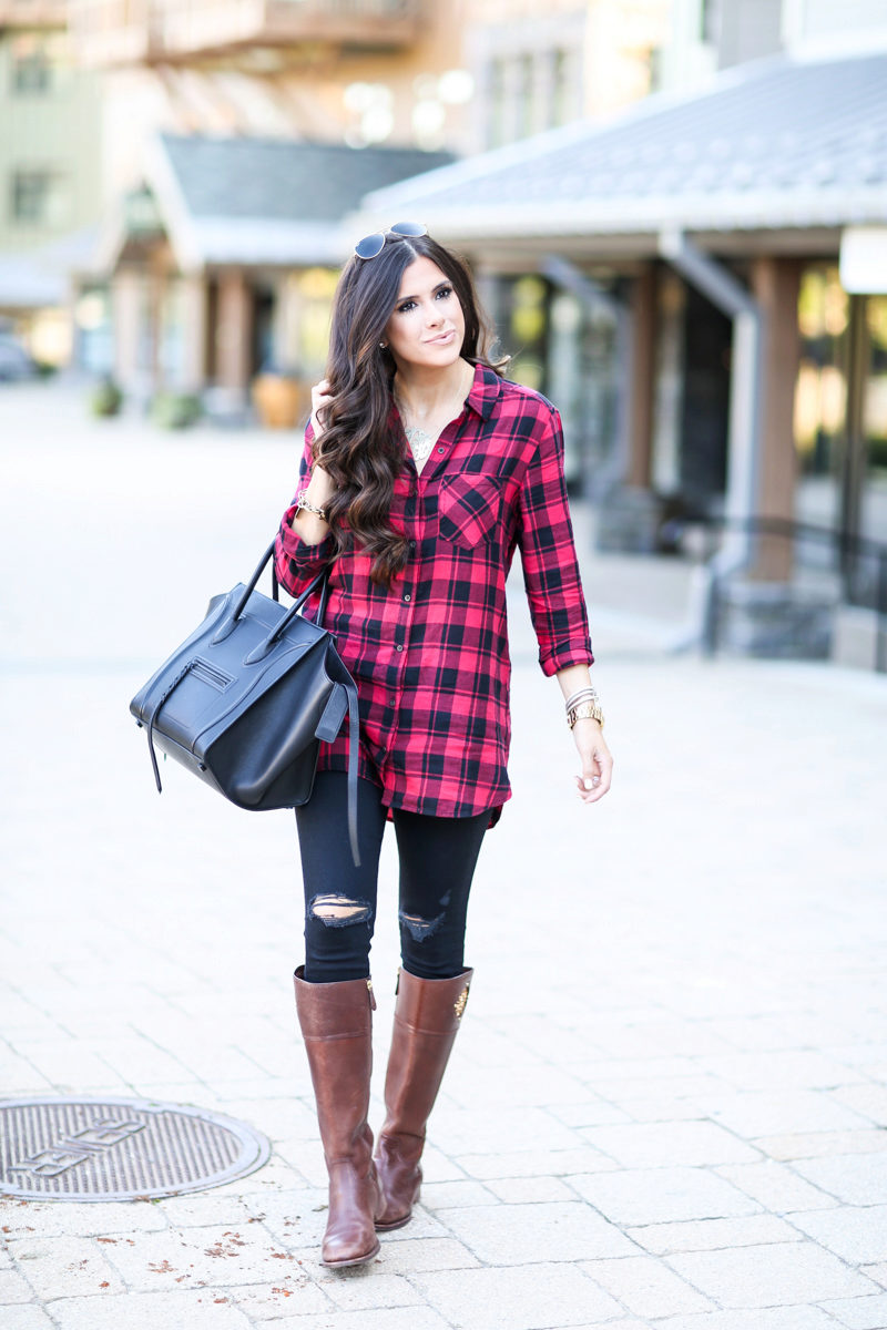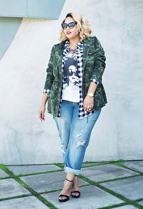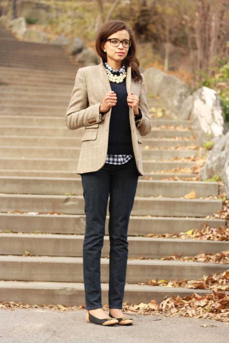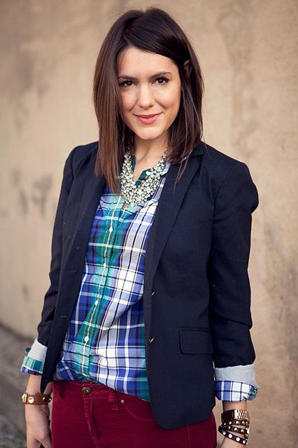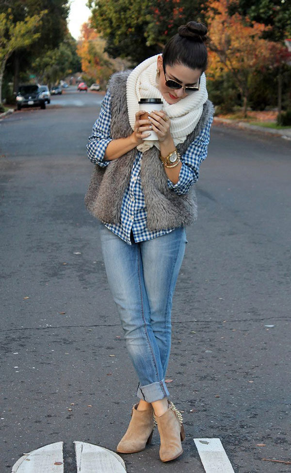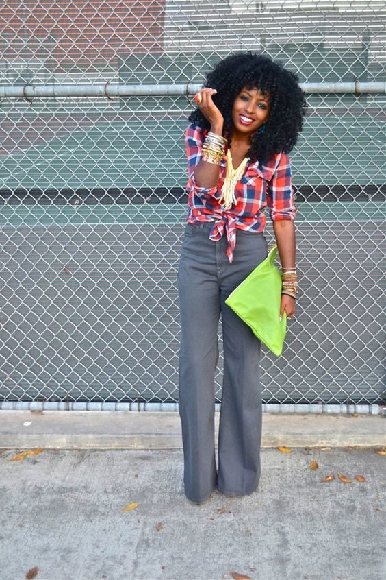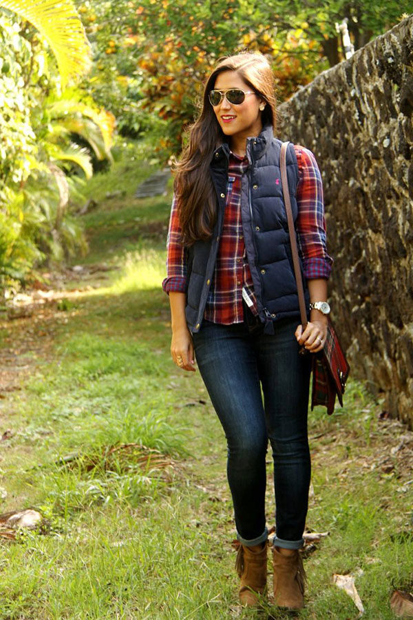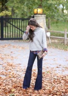 The most popular combination is jeans and a plaid shirt. You can choose the style at your discretion, skinny, boyfriends and even flared will be good.