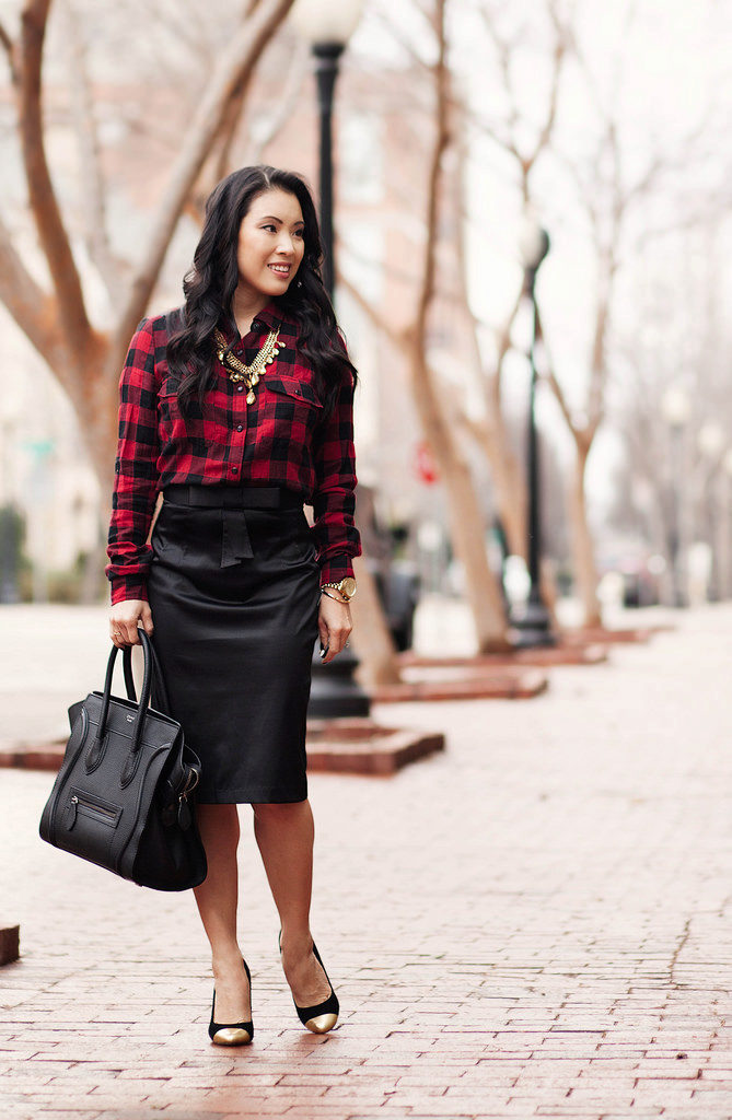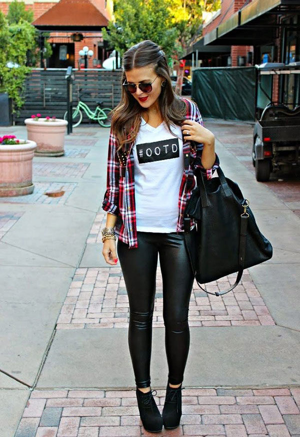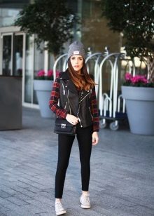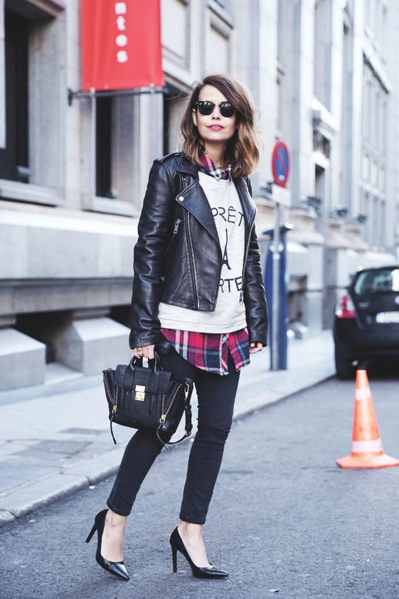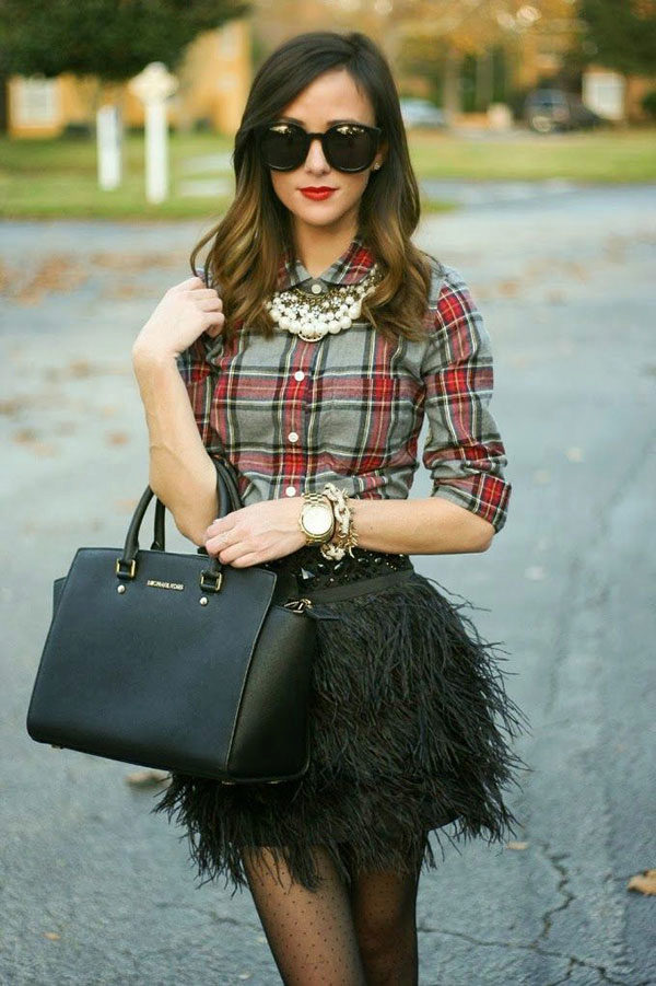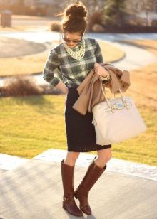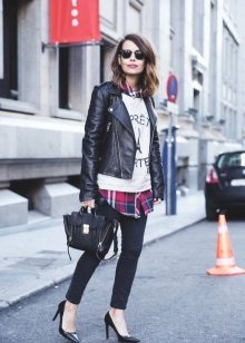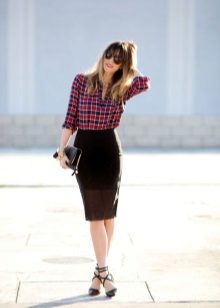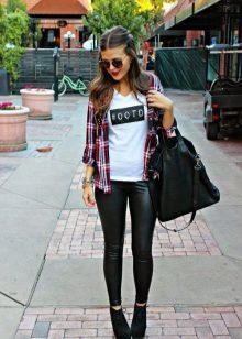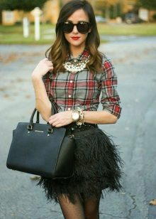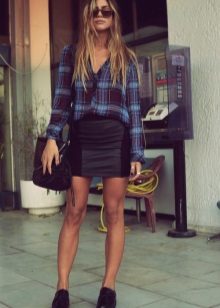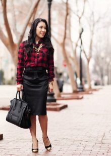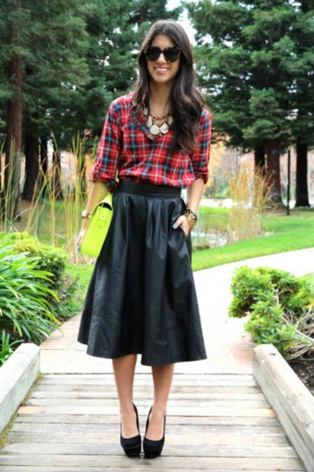 Going to a party? Then there is nothing better than a short leather skirt. It will be perfectly combined with dark tights, a plaid shirt and ankle boots with high heels.