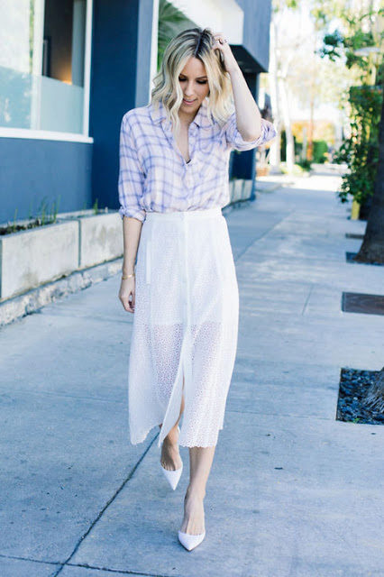 Delicate image that is perfect for dating. A white-and-lilac shirt with a snow-white lace skirt and white boats. A minimum of jewelry and accessories, only pure and immaculate refinement. This look allows you to visually see how feminine a checkered shirt can be. Perfect!