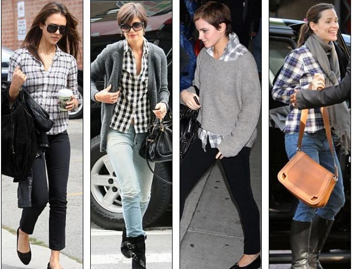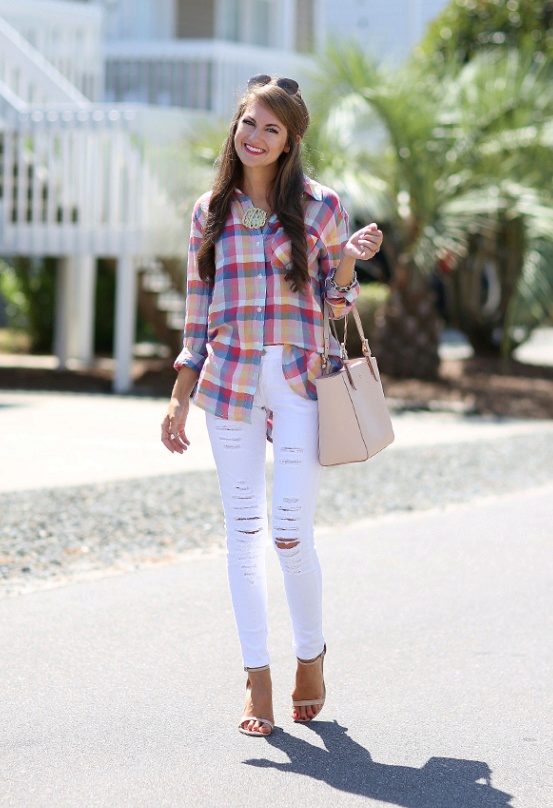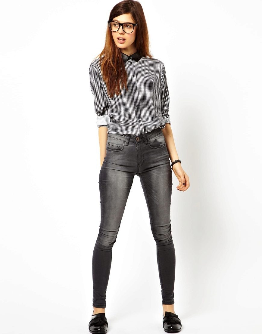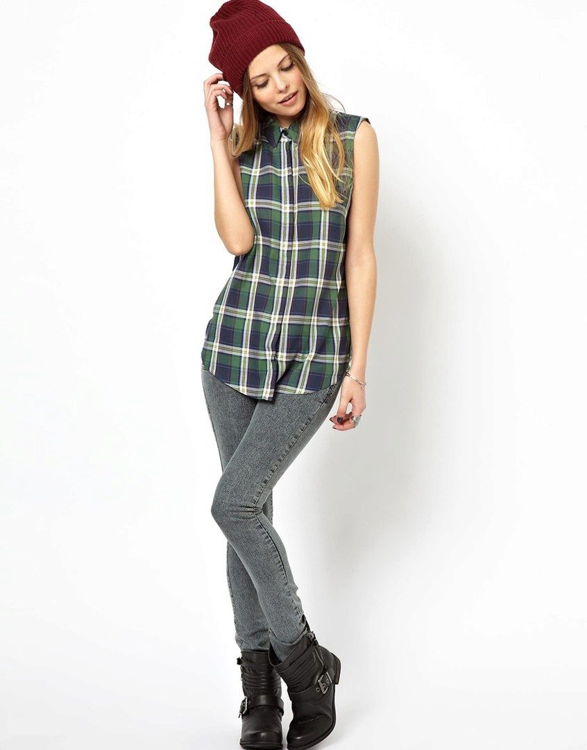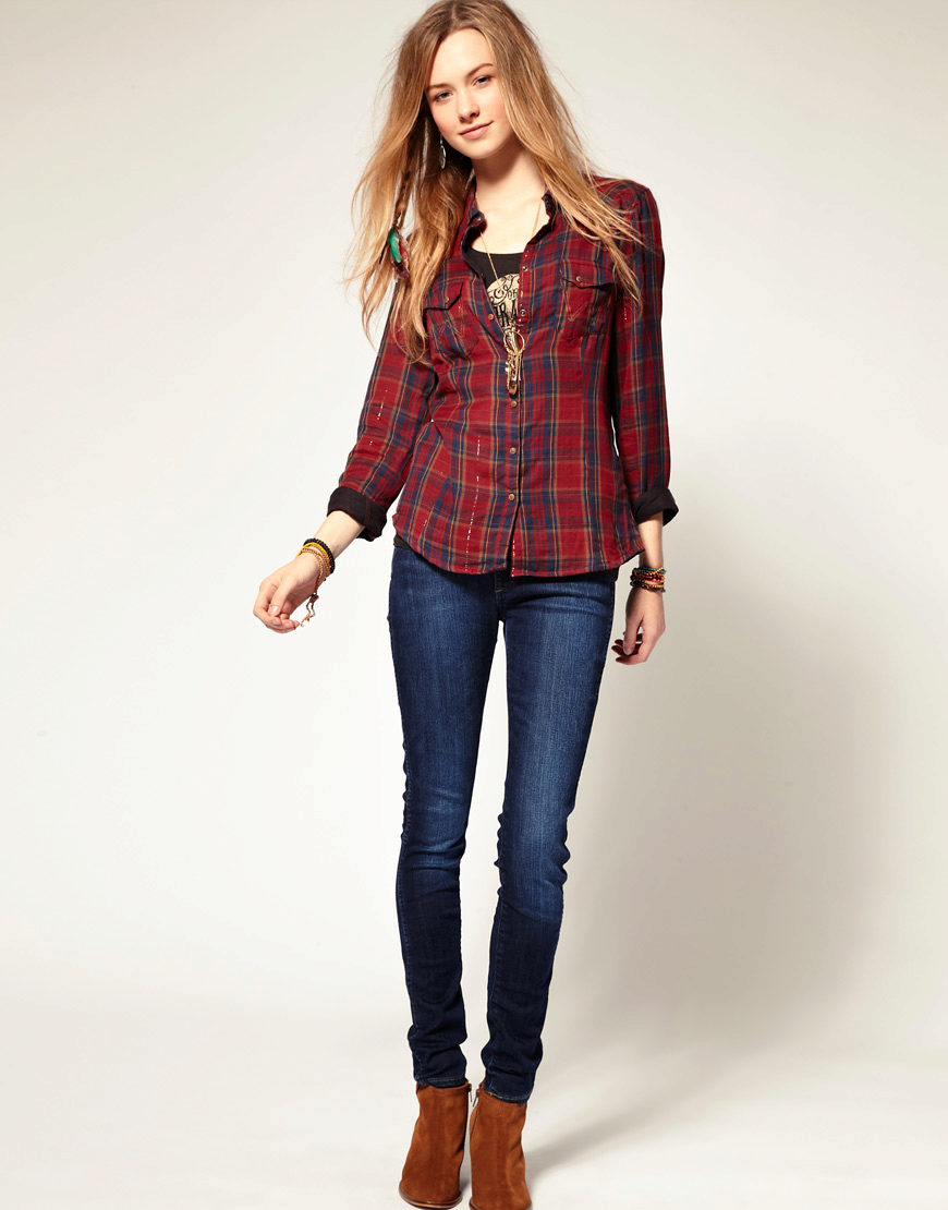 Jeans are known to form the basis of our everyday wardrobe. Naturally, paired with a plaid shirt, you get a simple but stylish look. It will not be anything unusual, but you definitely will not lose if you choose this outfit. However, you can make some variety. This can help a long knitted cardigan, which can be fitted with a thin woven strap, or a thin short sweater, which can be worn on top of the shirt, so that only the collar and the bottom edge of the shirt remain visible.