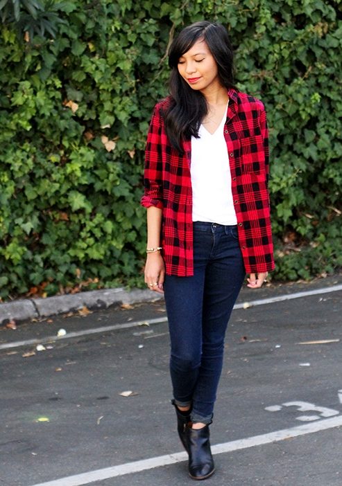 The most important rule to remember is to combine a plaid shirt with a solid bottom. These can be matching colors or one of the colors present in the checkered pattern.