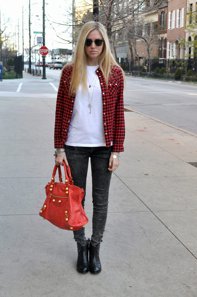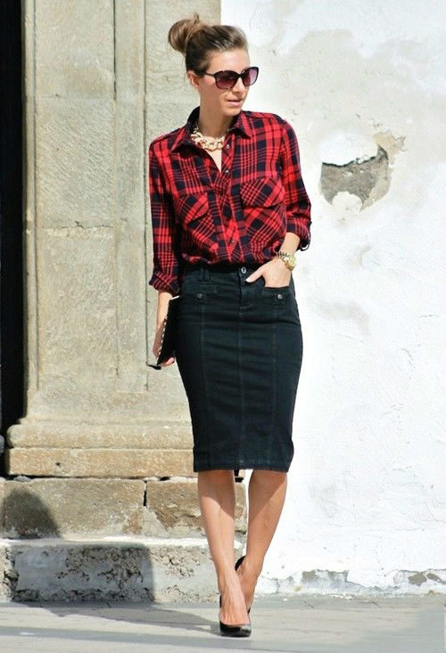 However, the classic version of the red shirt and black skirt has not been canceled! If you roll up a sleeve shirt, unbutton the top buttons, thereby opening the neck and creating a beautiful neckline, add a massive chain and a black denim pencil skirt, the image will be sexy and intriguing.