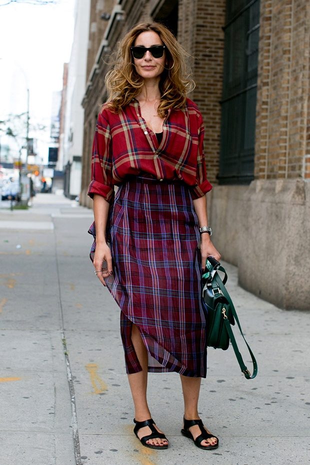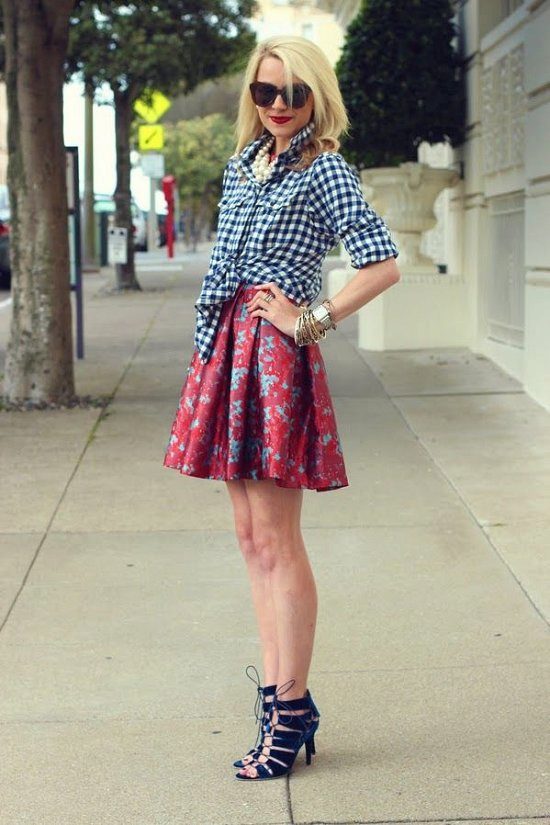 Images with skirts require a more careful and cautious approach. Do not forget about the rule about monophonic fabric! A red checkered shirt is more suitable for a red or black skirt. It is customary to fill the shirt in a skirt when drafting the kit. Also note the denim skirts that are very popular this season, as well as velveteen models. With skirts you can make very unusual and beautiful everyday looks that will surely be more unexpected than the options with jeans or shorts.