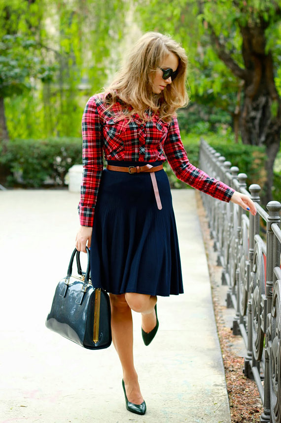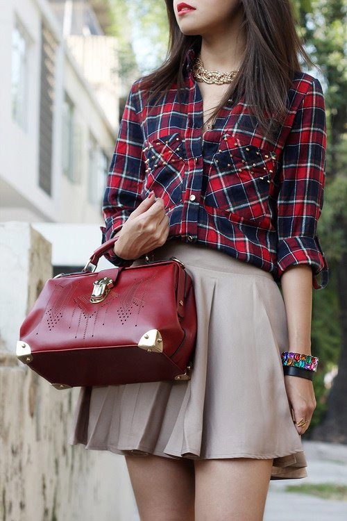 Even a checkered red shirt can create a calm, unobtrusive, stylish and practically businesslike look. Most likely it is suitable for study or for informal business meetings. How to get it? It is enough to tuck in a shirt with skinny jeans of deep blue color, add a warm navy blue jacket, beige high-heeled shoes and a bag on the shoulder. The image will be comfortable and fashionable at the same time.