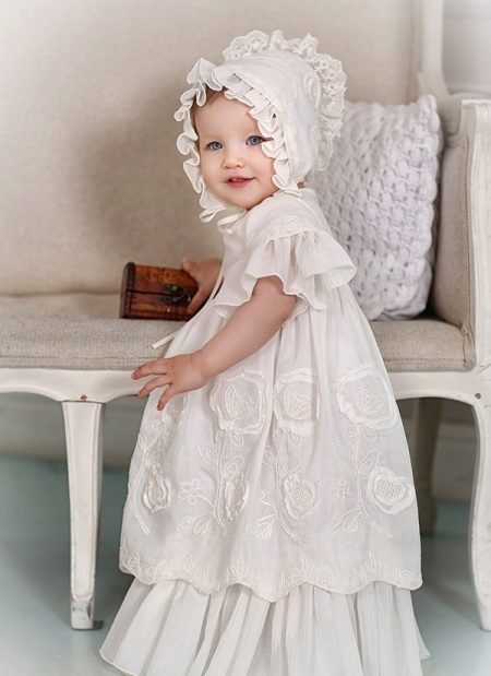 For girls of primary school age produce baptismal dresses. They differ from shirts in a more complex cut, fitted silhouette and rich trim. But all the traditional elements of the baptismal shirt — color, length, sleeves — are preserved in such a dress.
