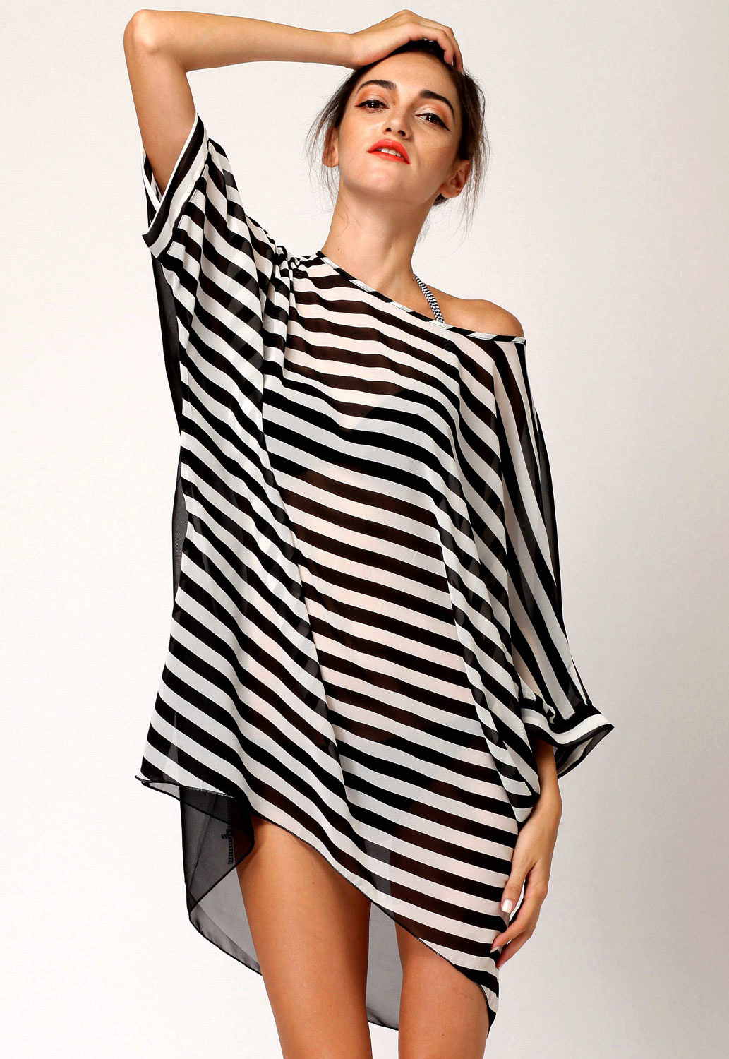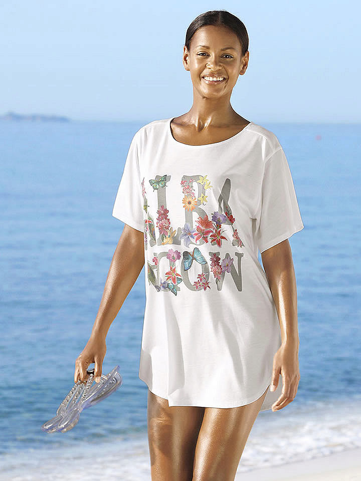 As for color, the choice is unlimited. Very popular models of bright fabrics with juicy and original prints. A beach shirt can be polka-dotted, striped or checkered. Monophonic versions are admissible, but, preferably, with a floral pattern, an interesting ornament, inscriptions or graphic elements. Especially fashionable are beach tunics on the marine theme.
