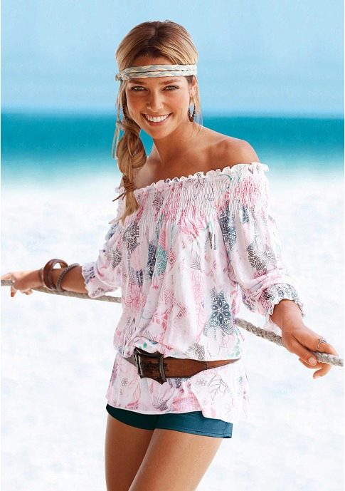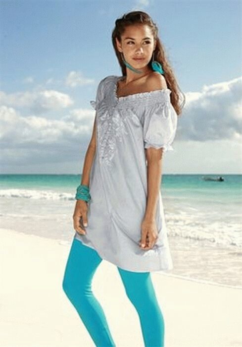 You can use the tunic as a separate part of your wardrobe only if you have a good figure without flaws. This is the perfect beach look. The shirt can be worn over a swimsuit. You can choose woven flip-flops from your shoes, and sunglasses and a stylish beach bag as accessories.