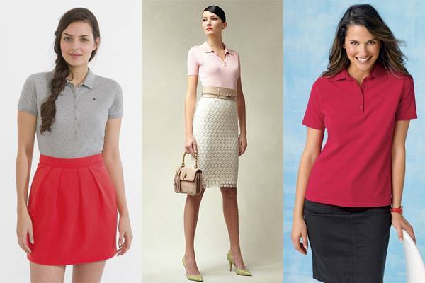 Skirt polo is not an ordinary combination. But a strict skirt and a monochromatic polo of a non-bright shade will make an elegant duet in a business style. By the side fit or pumps on a heel, or shoes with a massive heel. Slender girls are better off choosing a fitted shirt and tucking it in a skirt, and ladies with curvaceous shapes have a loose polo for release. Also in cool weather, a jacket will complement this look.