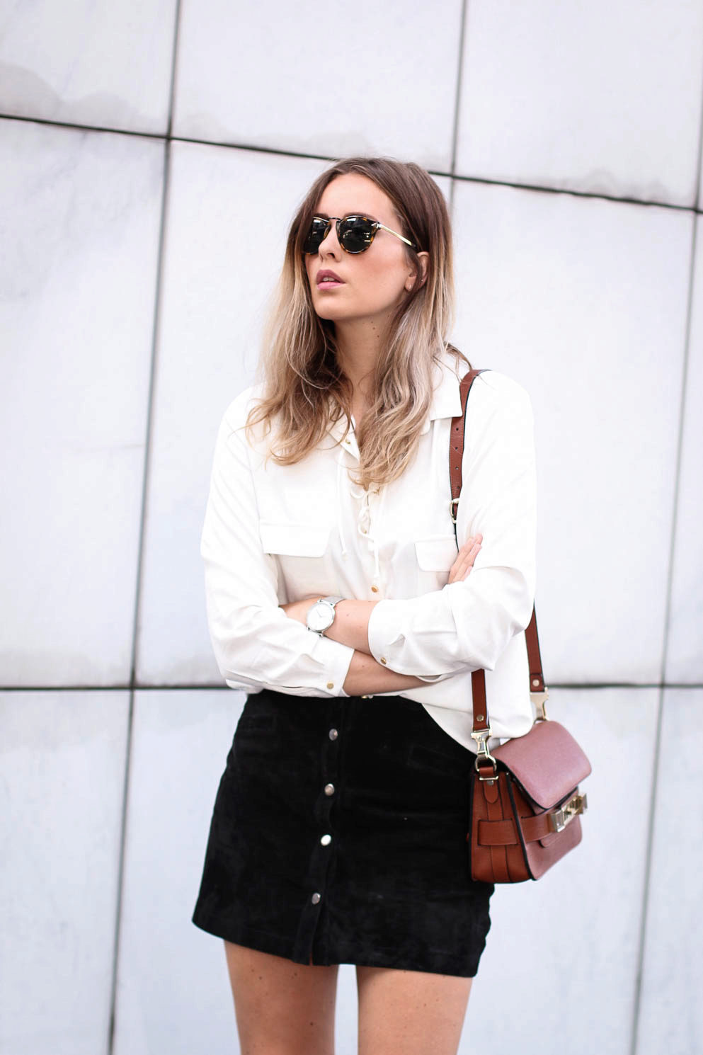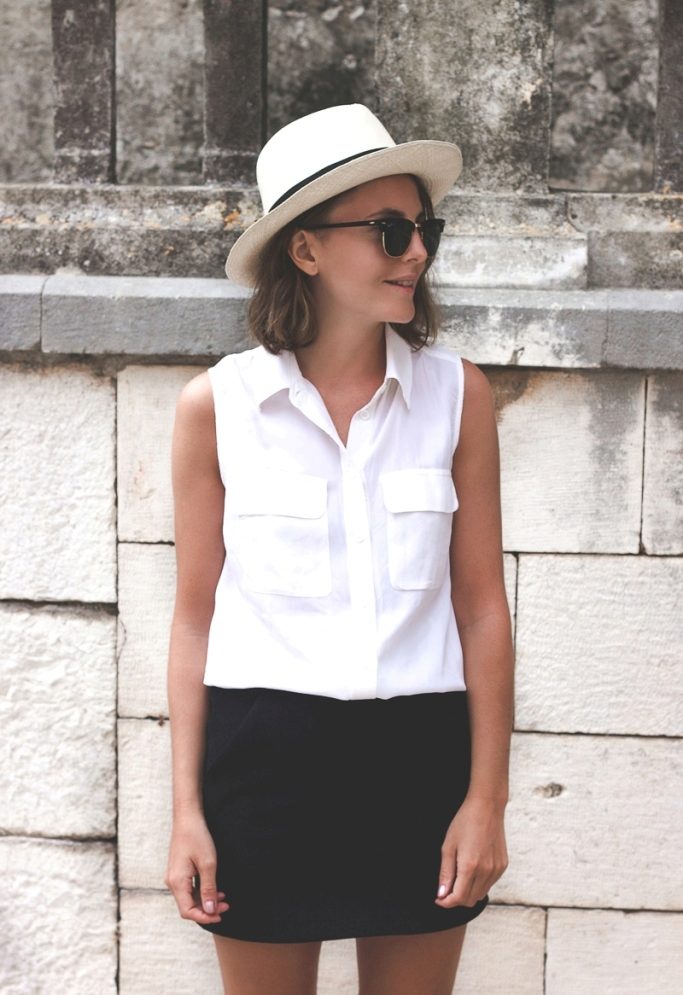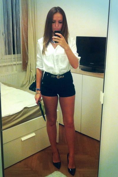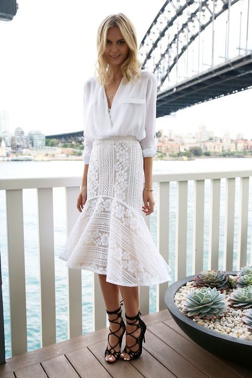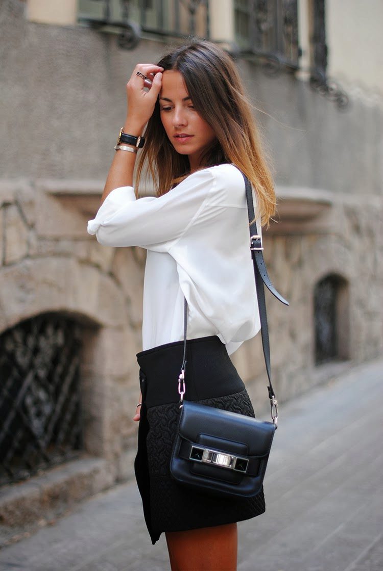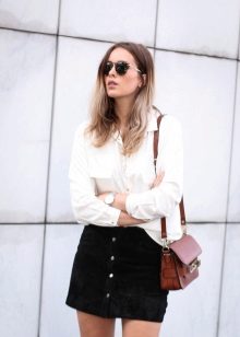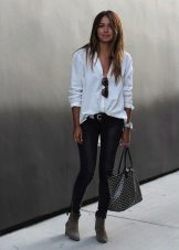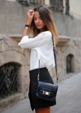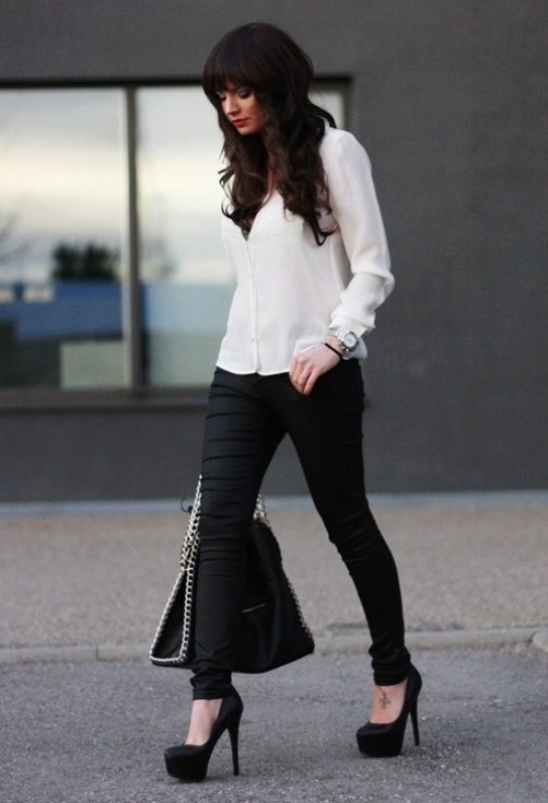 Also, a white shirt looks great with leather goods. This is also a kind of classic. From the styles, choose a mini pencil skirt, flared below the knee.
