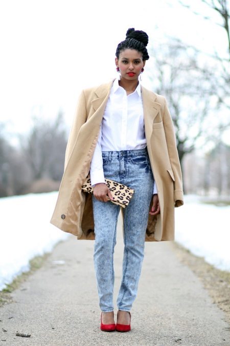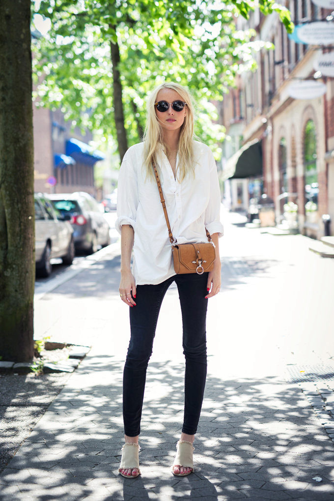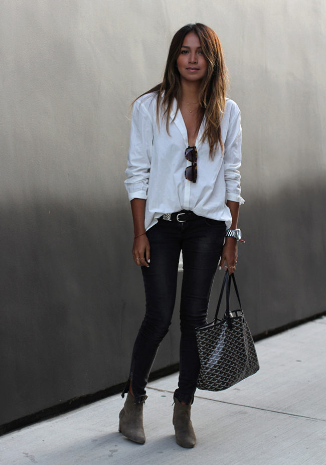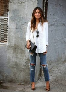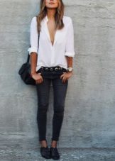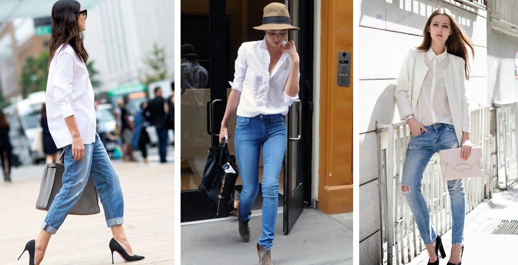 White shirts are combined with jeans of any style. This image is a classic for everyday life. Wear a shirt tucked into jeans just in front, this will give you originality. Jeans and a white shirt are just made for each other.