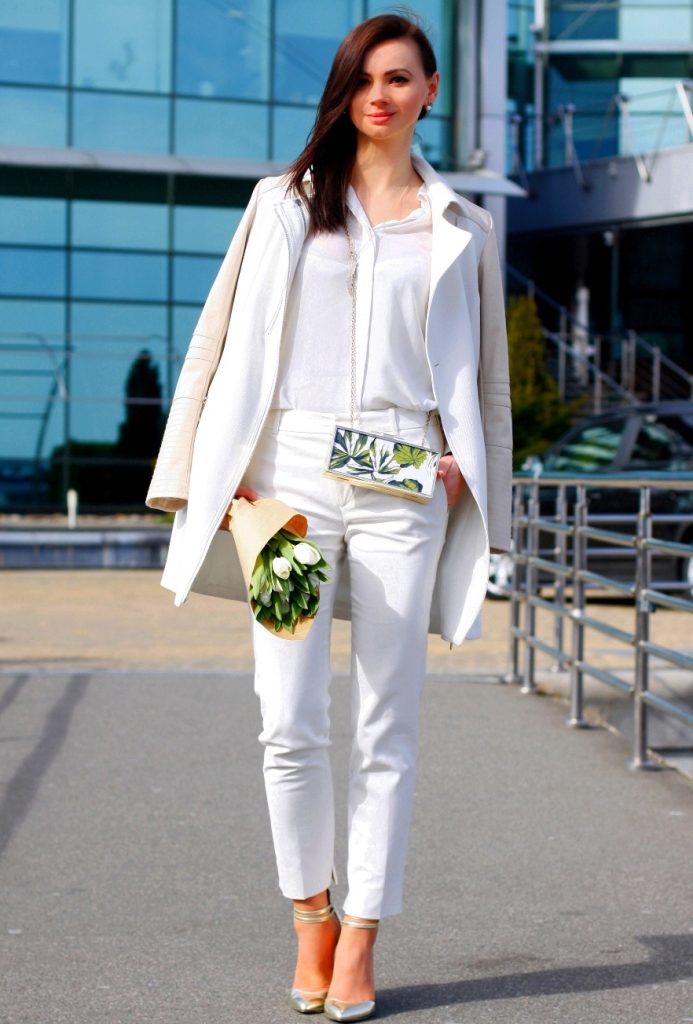 Totally white is the trend of recent seasons. It will help create a luxurious look. At the same time focus on bright jewelry and shoes, make-up and manicure. This color combination will suit girls with a slim physique.