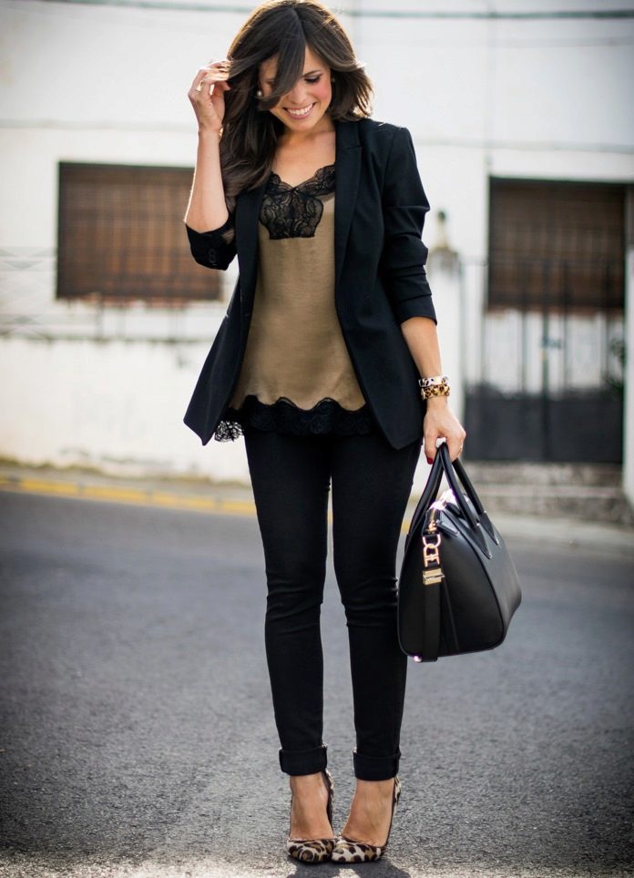 Dress with a black blouse looks strict and sexy at the same time. Black is capable of seducing anyone. It goes well with gold jewelry, with an emphasis on detail.