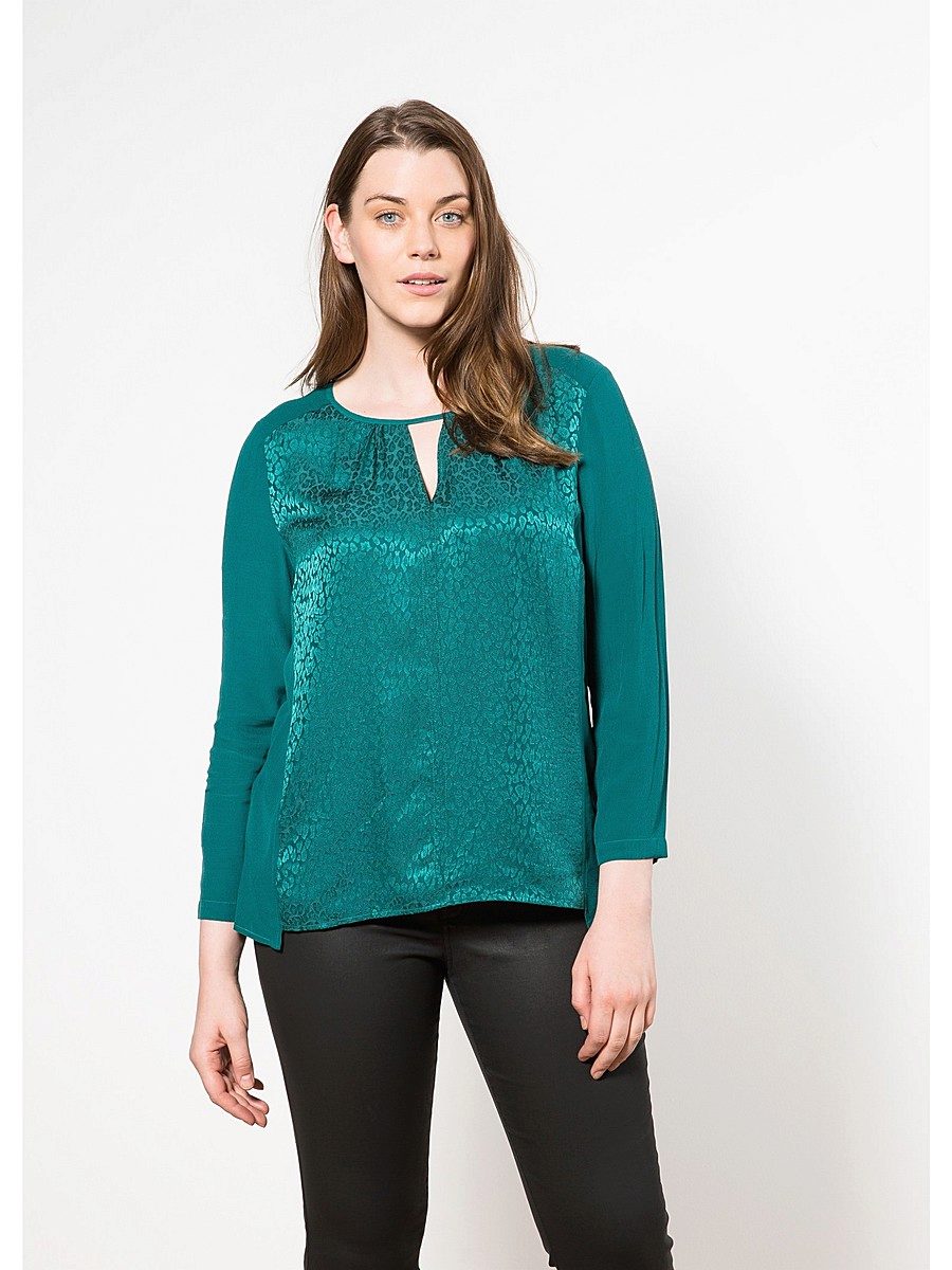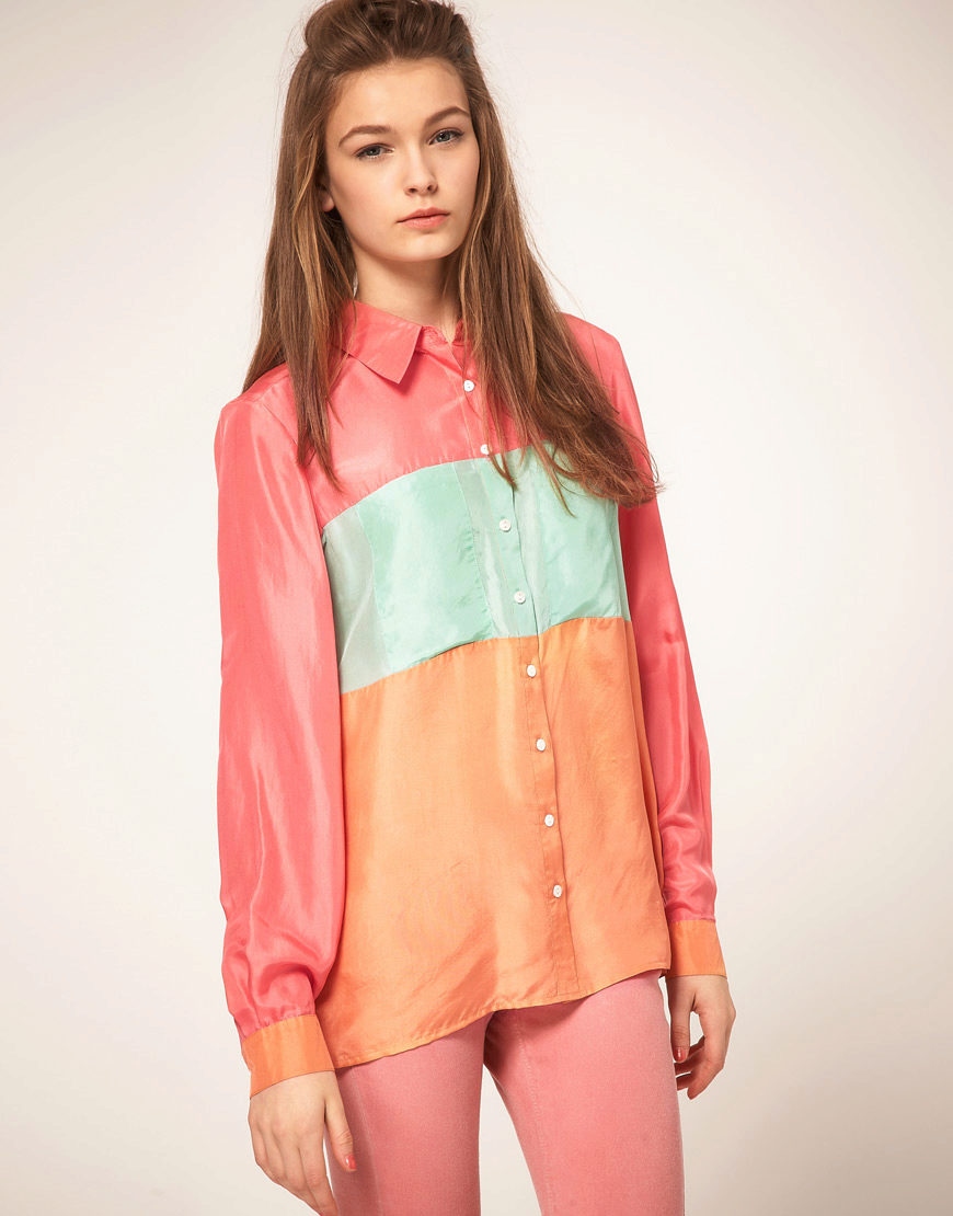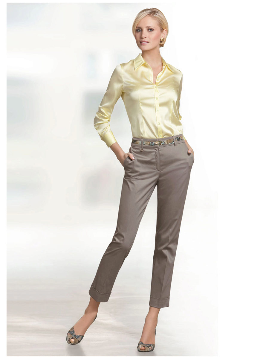 Another style of silk blouse - with contrasting inserts. Pants can be changed to a skirt, add some fine jewelry and go to conquer professional tops.