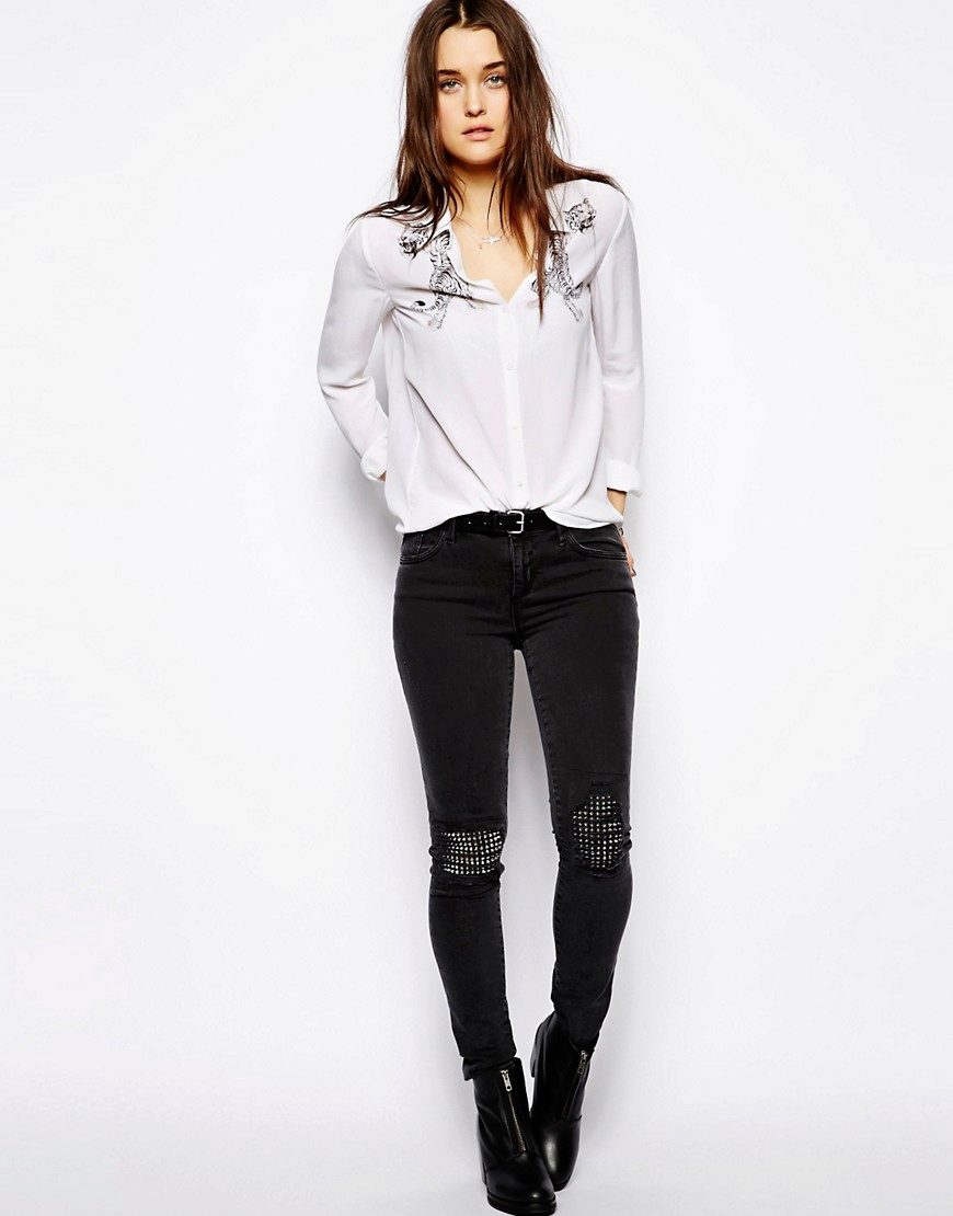 Urban style in the best traditions. A white loose, slightly asymmetrical shirt with a decorative pocket on the chest, skinny and shoes with an animal print look original and unblinked. In this outfit you can in the cinema and in the cafe.