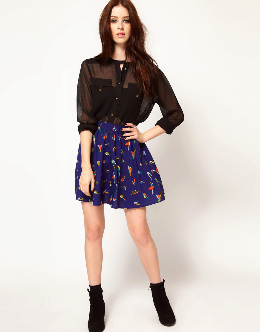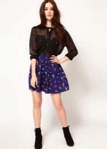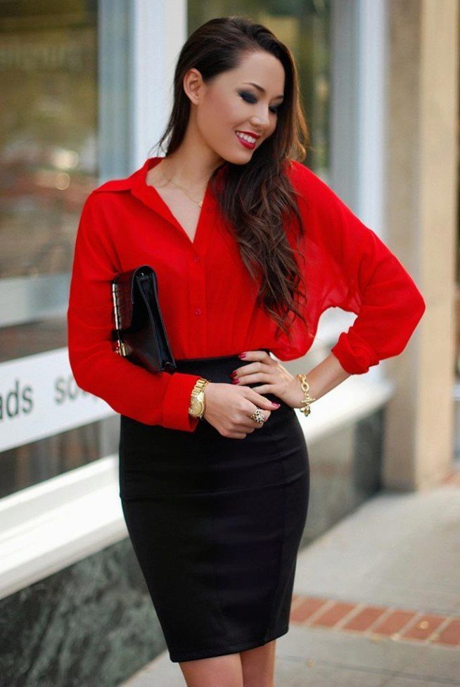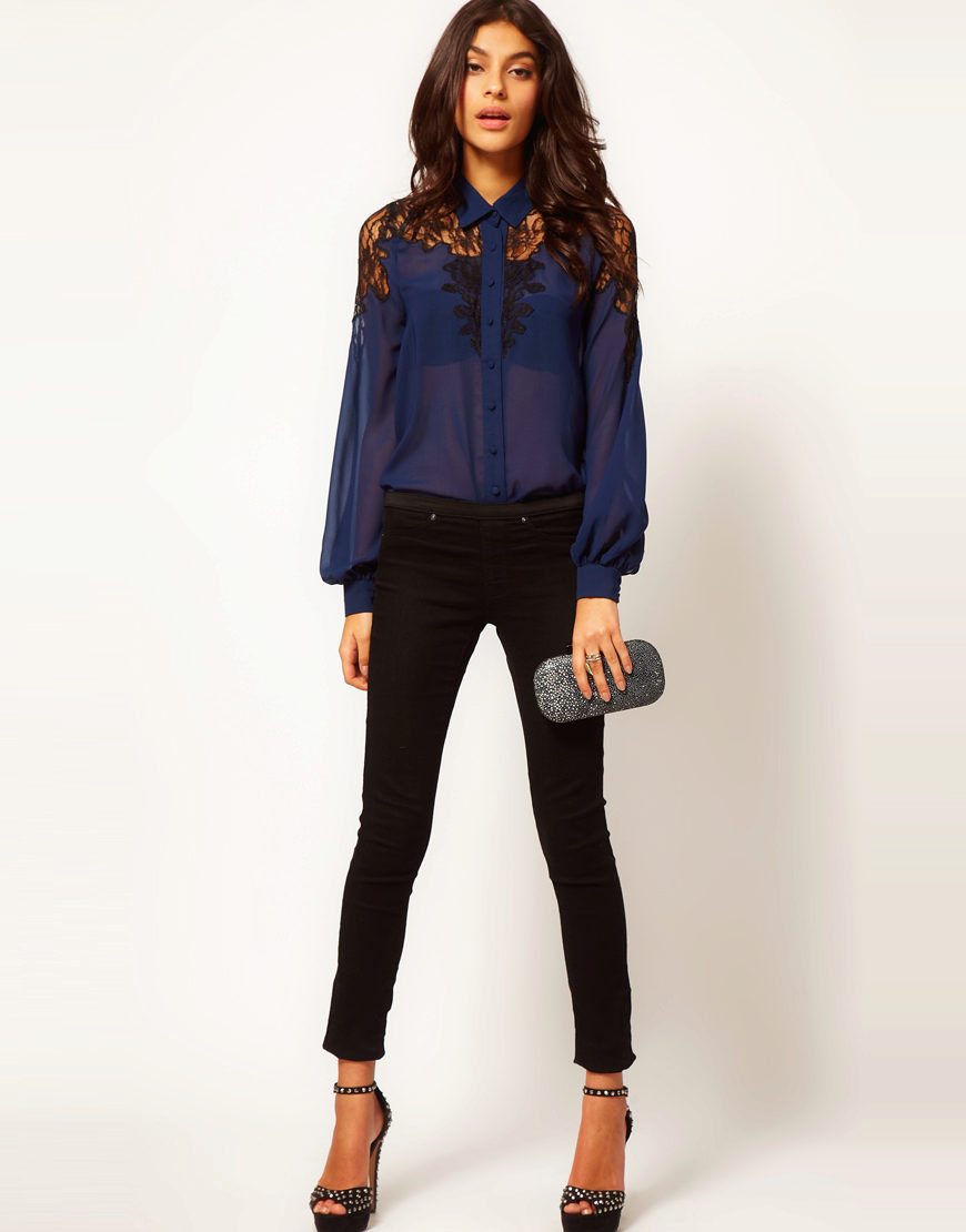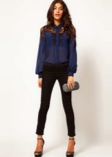 At the party chiffon shirts of black, dark blue and bright colors will look great. Pants are better to choose black or dark blue. In the evening, things look good leather goods - skinny pants, skirt. Not superfluous heels. Complete the look with accessories.