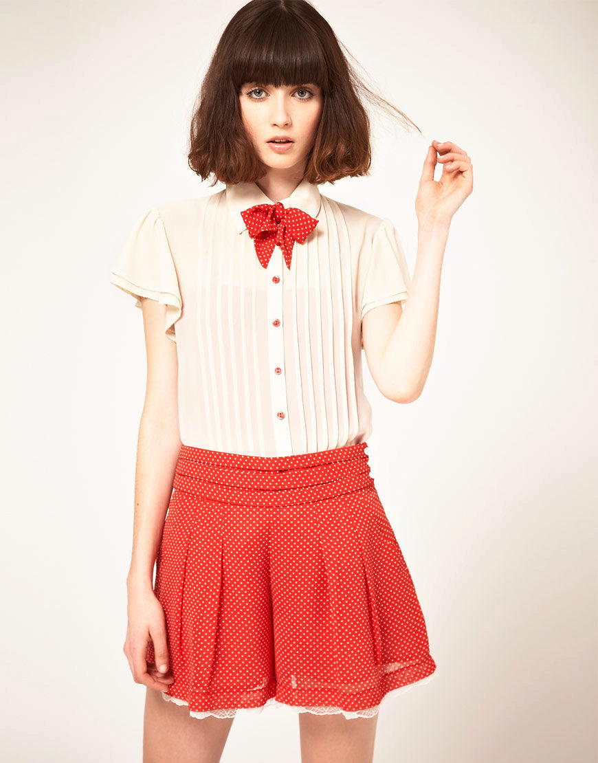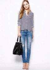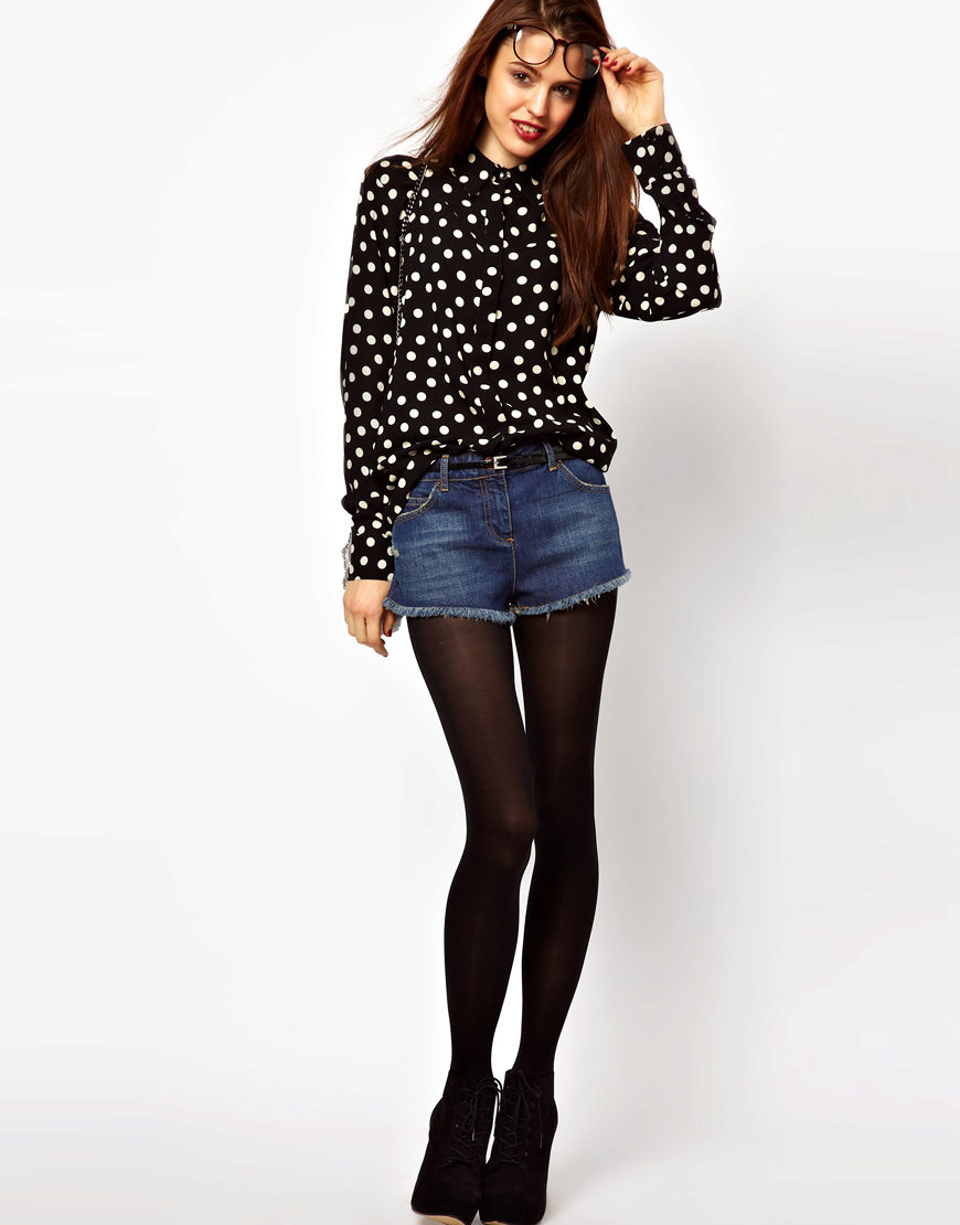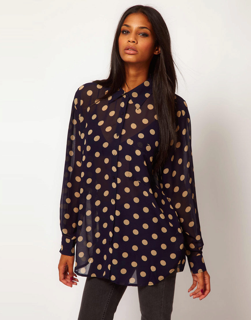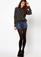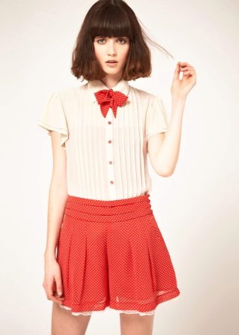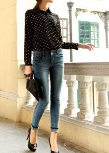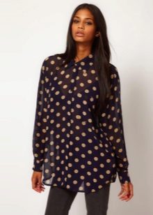 The strip visually lengthens your silhouette. Floral print gives the image of mystery, as long as it overlaps with the shades of pants or skirt. Polka dots look very feminine, especially if this is a shirt model with a rounded collar.