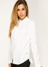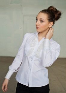 - Dress shirt Ideal for romantically minded ladies. As a rule, such a shirt is richly decorated with various bows, ruffles, ruffles or frills. An elegant model can be performed in a combination of several materials, supplemented with lace inserts, etc. Sleeves can be straight and fluffy, narrow and loose. The shirt can be complemented by an elegant collar of the original form, jabot, decorated with sequins or embroidery.