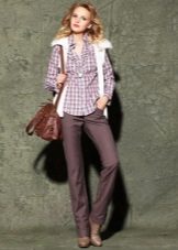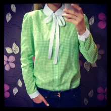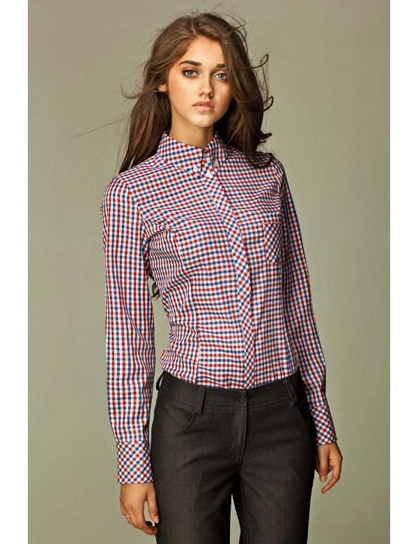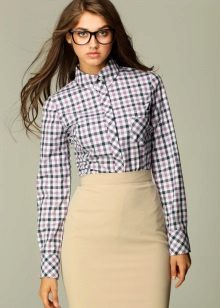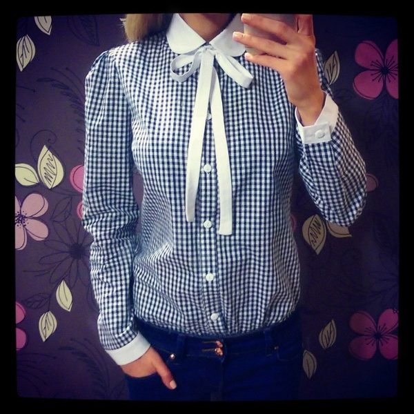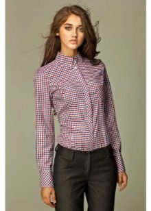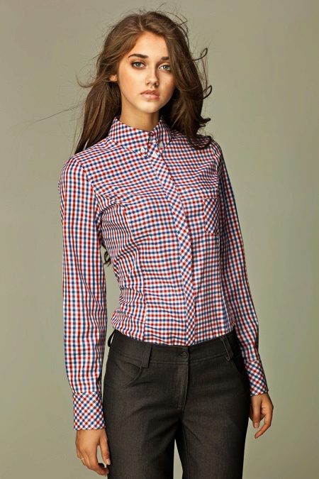 As a business attire is perfect cotton shirt - body with long sleeves, in the small cell of white, blue and red colors. In combination with dark gray trousers in classic style and elegant pumps, the image will perfectly fit into the framework of an office dress code.
