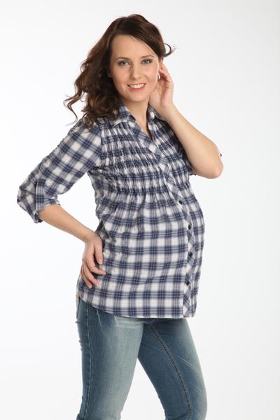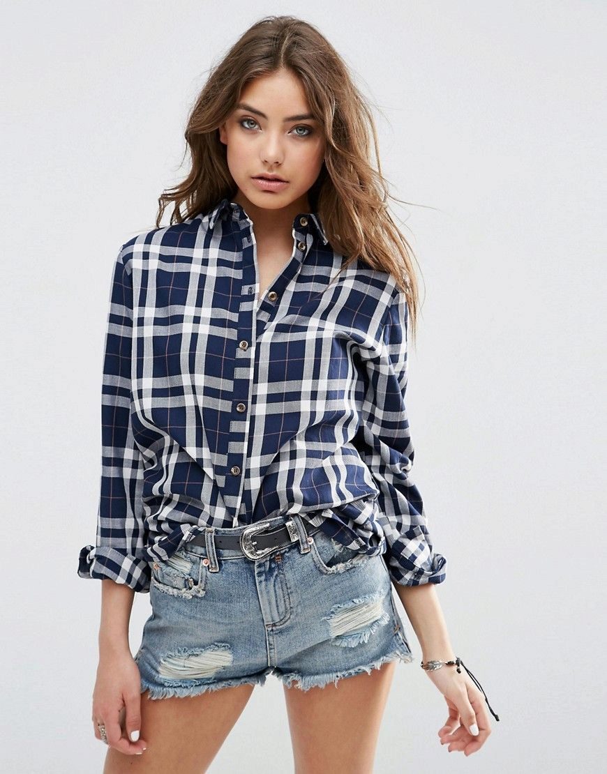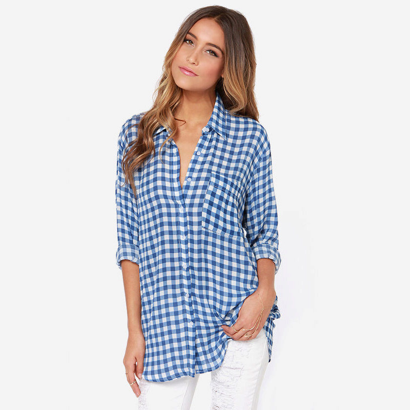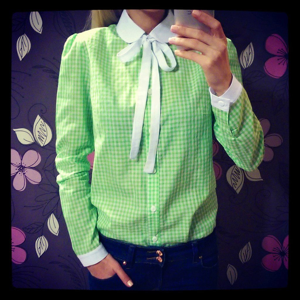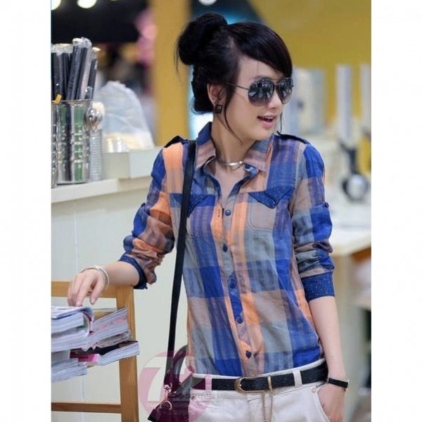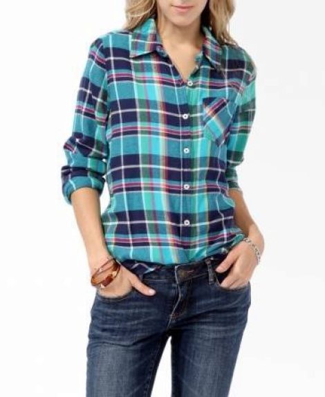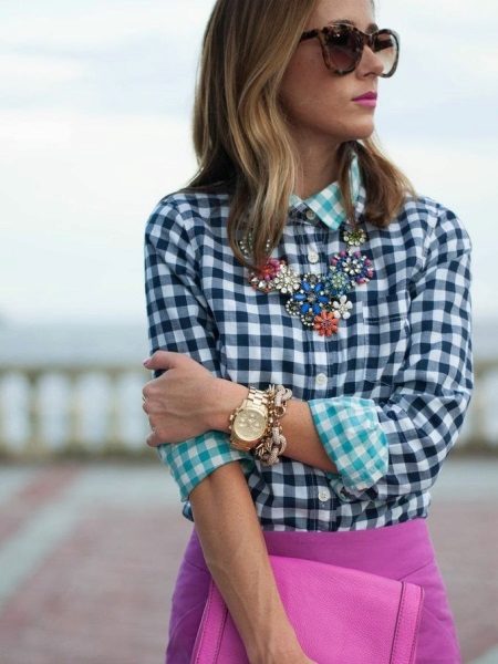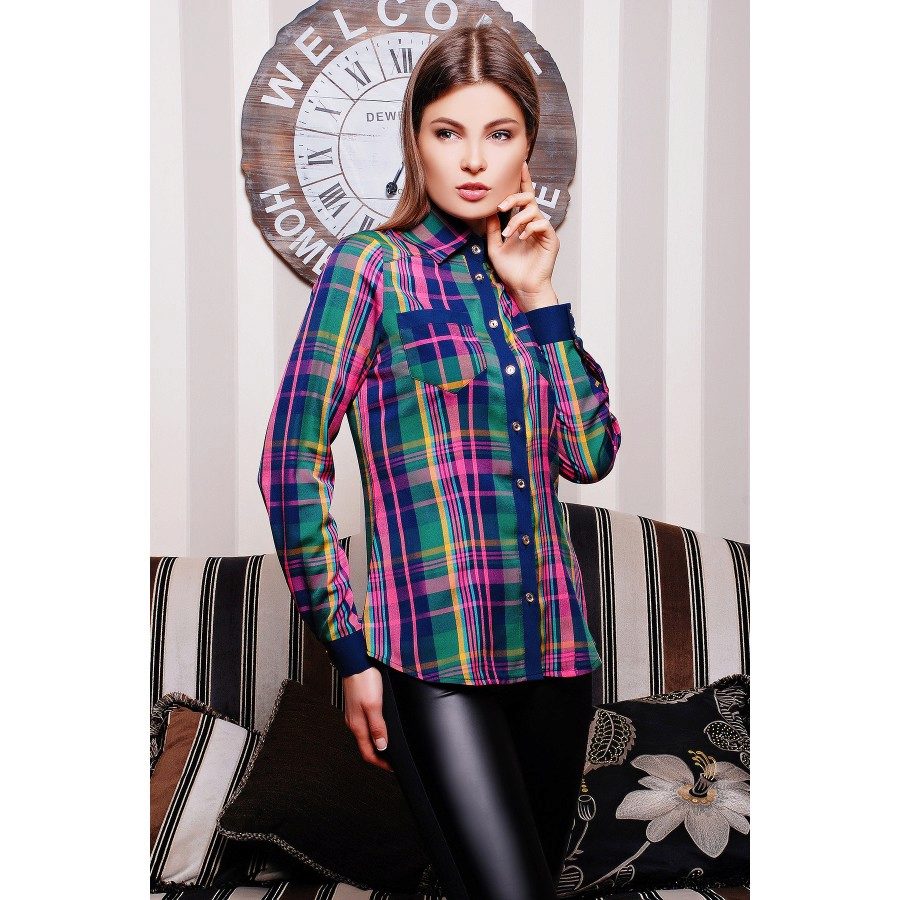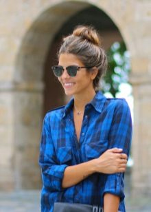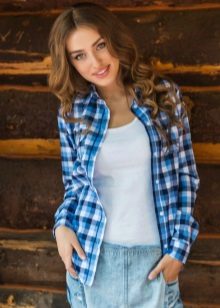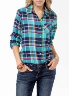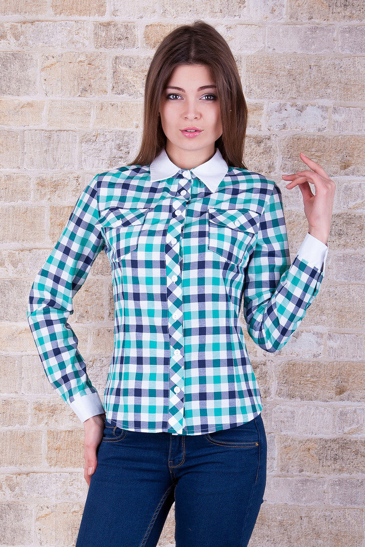 The blue shirt is perfect for absolutely all girls, because the dark blue color can both hide flaws and highlight its merits. It looks very stylish model of a blue shirt in a green cell, because these colors are very well combined with each other.