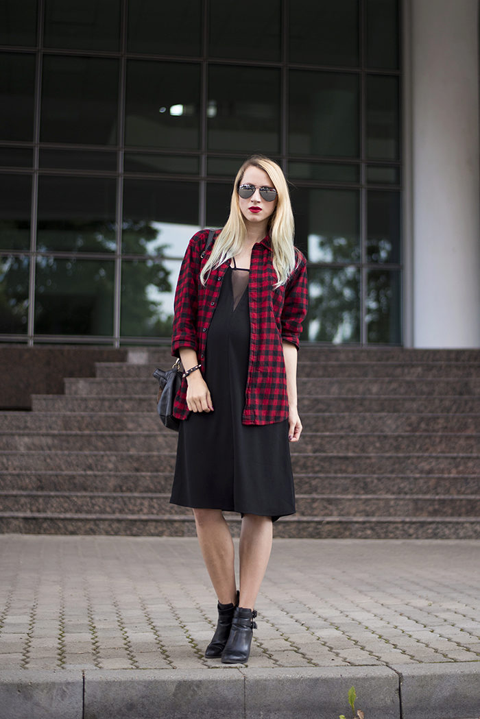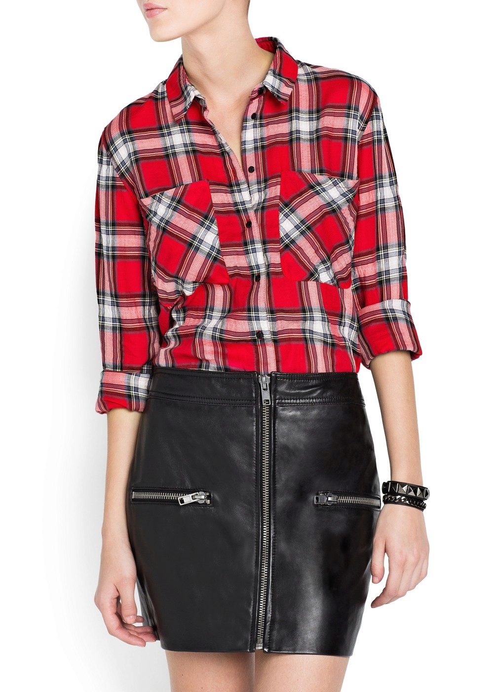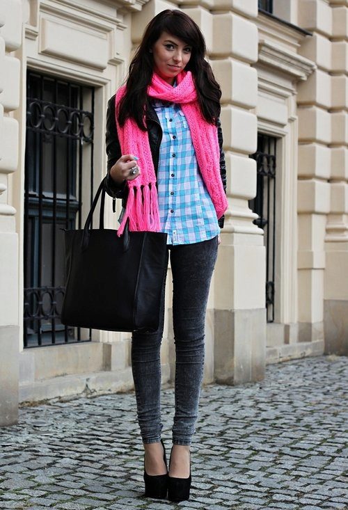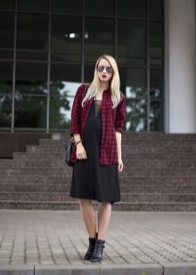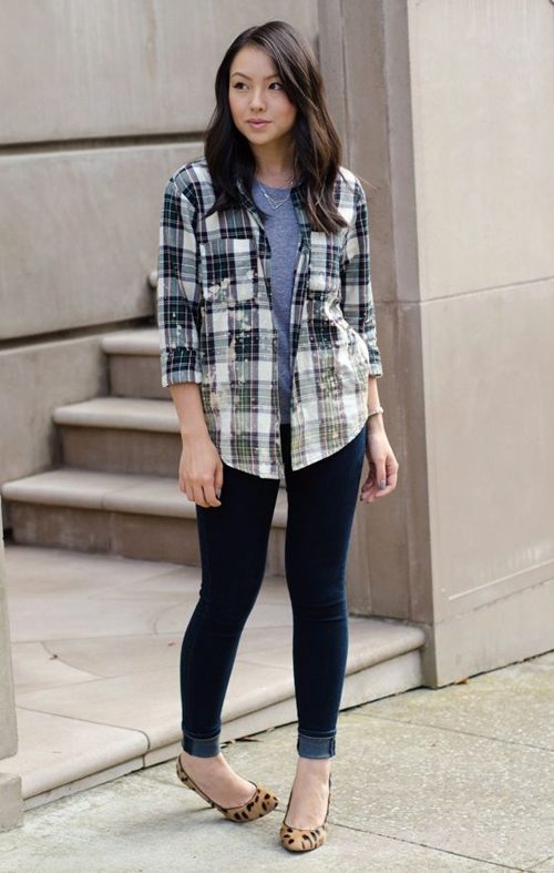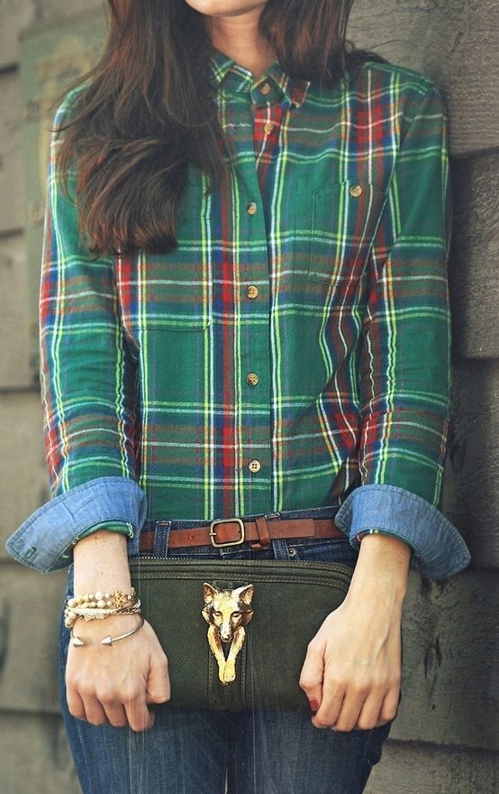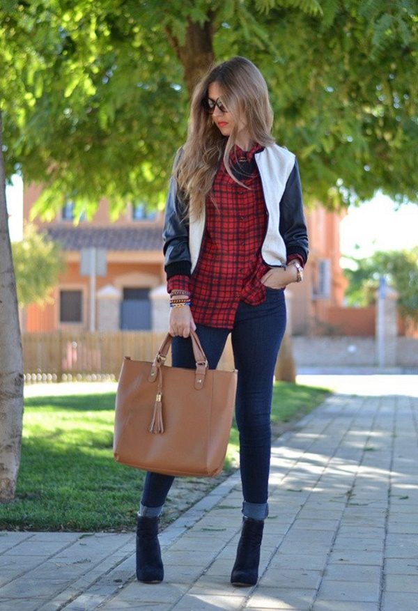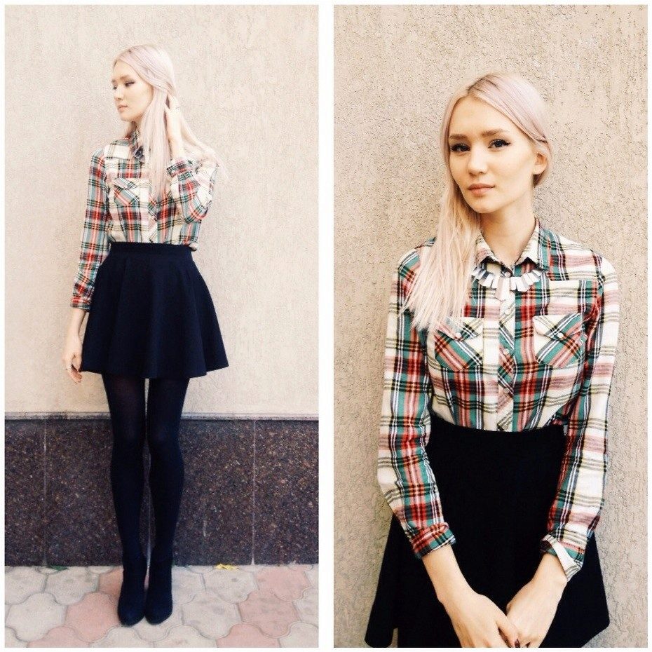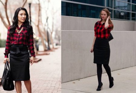 A plaid shirt in the Scottish style, combining white, green and red shades would be an excellent option for a walk with friends or a date. This model will look great with a black skirt cut half-sun, whose length is above the knee. Tight black tights and suede ankle boots on the platform are a great addition to the look.