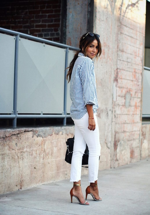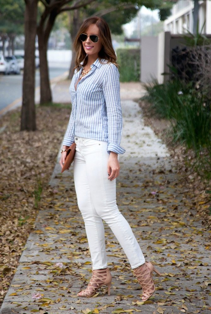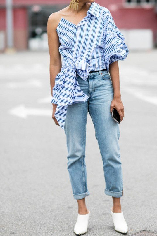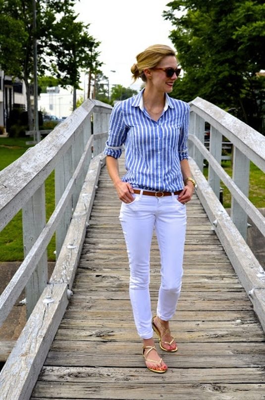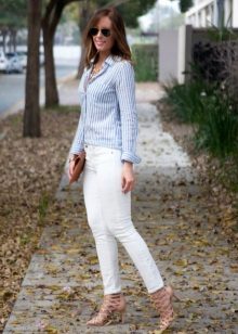A white and blue striped shirt is one of the fashion trends that is always up to date. Depending on the trends, it can be decorated with ruffles, embroidery, lace. It can be the basis of the everyday image or become an element of festive attire. In both cases, you will look very stylish.
