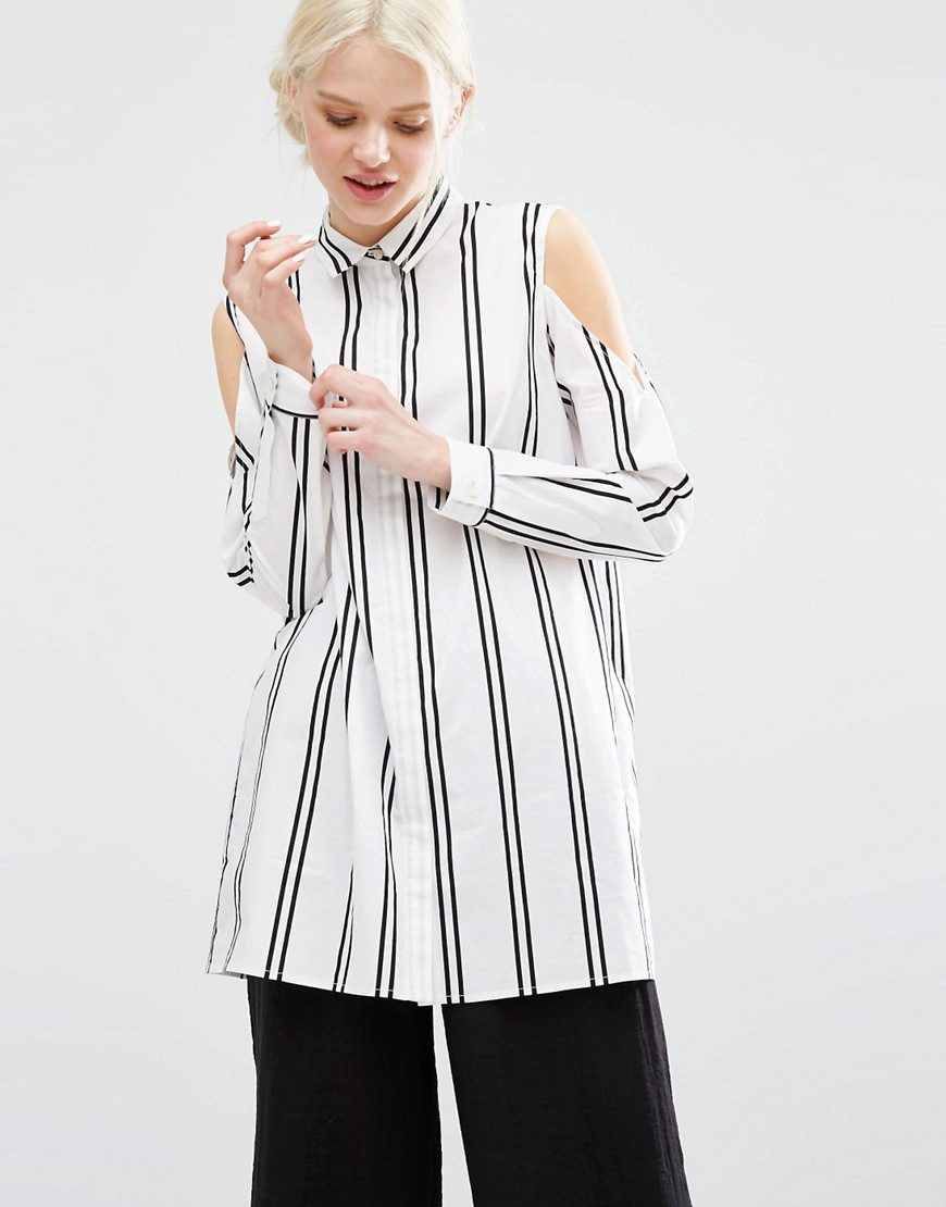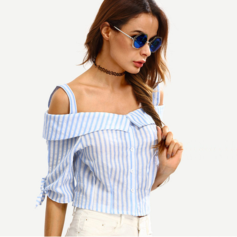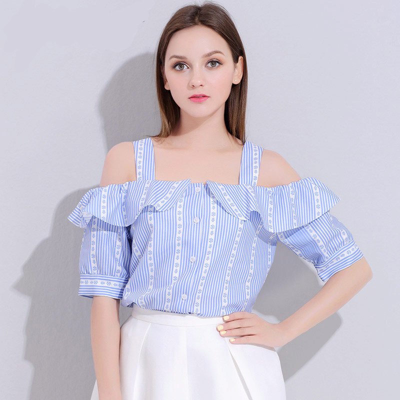 This season is very popular shirts with cutouts on the shoulders. This style demonstrates the shoulders, but everything else leaves the imagination of others. Most often, you can find cotton patterns in small stripes. Bows or ruffles are used as a decorative element.