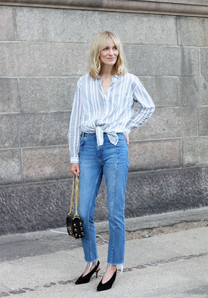 A vertical striped shirt is a classic. If you choose the right width of the bands, you can visually stretch the silhouette and add elegance to the image.